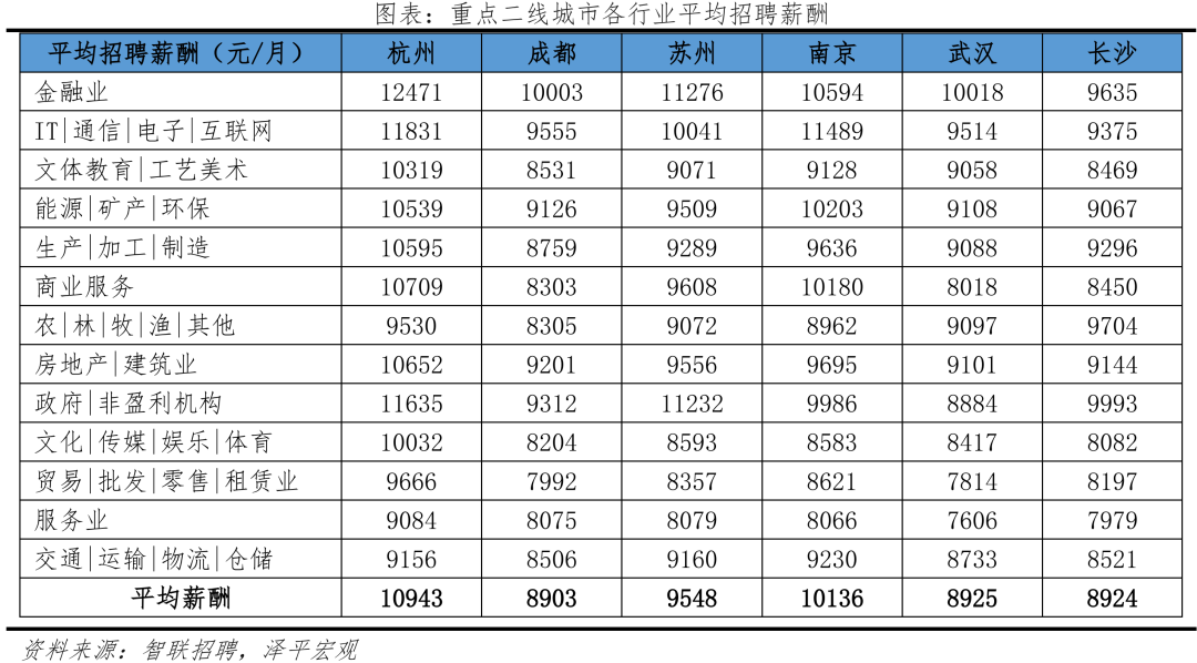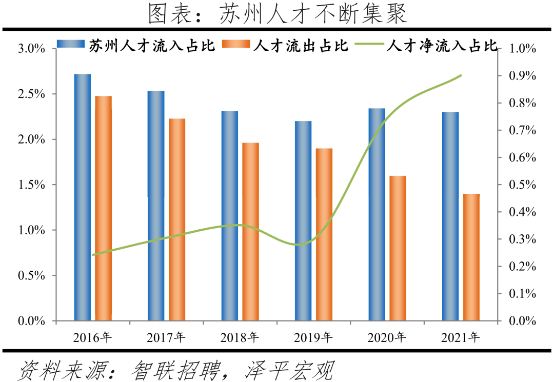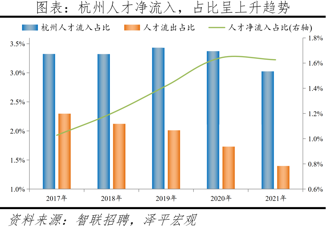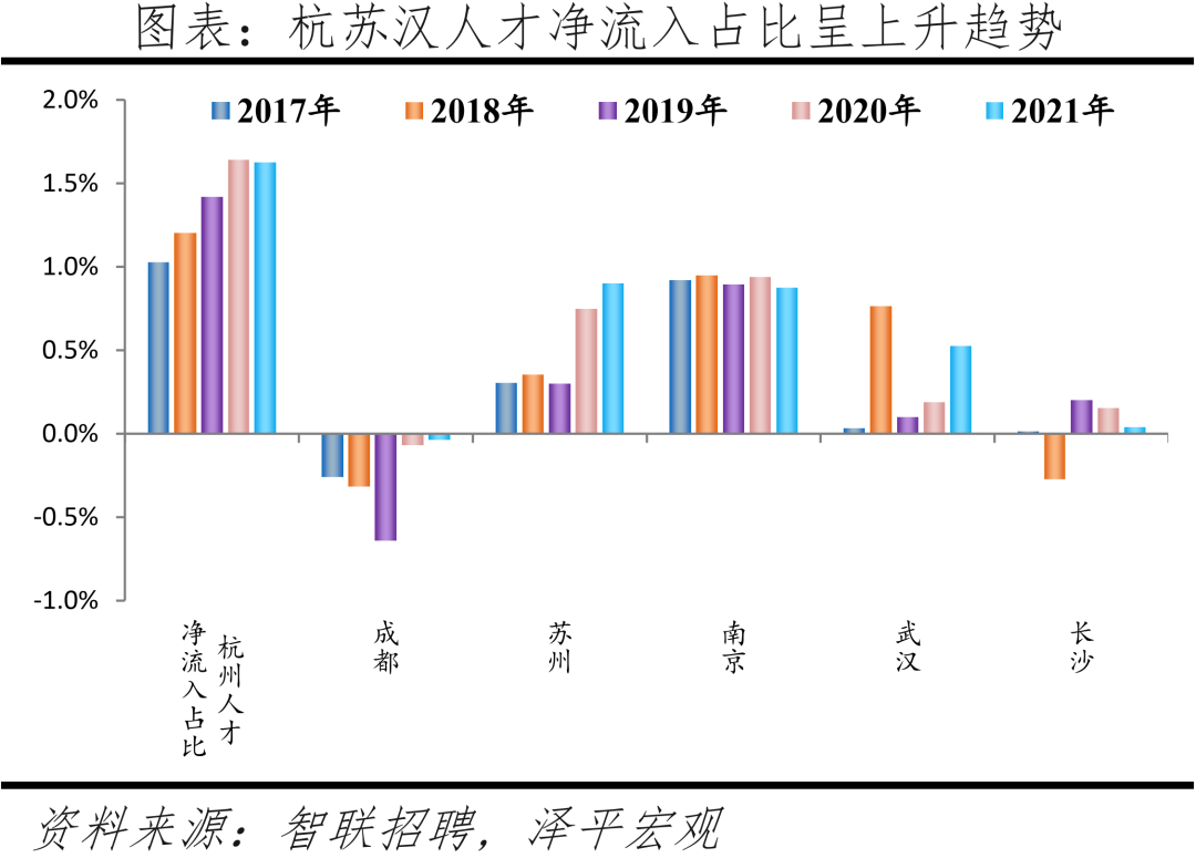 从2021年人才净流入占比看,6个重点二线城市杭蓉苏宁汉长分别为1.63%、-0.04%、0.9%、0.88%、0.52%、0.04%,杭州最高、成都最低。从2017-2021年人才净流入占比变化看,杭州从1.0%逐年升至1.6%,因电商为代表的产业发展迅速、环境宜居且薪酬相对较高;苏州、武汉人才净流入占比呈上升趋势,分别从0.3%、0.03%升至0.9%、0.5%,人才集聚明显,2021年苏州GDP同比增长12.6%,为重点城市最高,武汉2017年开始实施“百万大学生留汉”政策留住人才;南京人才持续净流入,且占比持续保持稳定,南京2018年“宁聚计划”实施、落户政策宽松吸引人才;成都近年人才净流出占比逐渐下降,有集聚趋势,且对高学历人才和年轻人吸引力增强;长沙近年人才净流入占比较稳定。