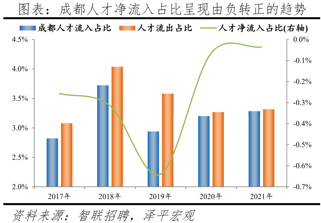 2)成都:2017-2021年人才净流入占比分别为 -0.8%、-0.3%、-0.3%、 -0.6%、 -0.1%、0.0%,整体上呈现由负转正的趋势,对高学历人才和年轻人吸引力增强,2021年成都硕士及以上人才流入占比、应届生人才流入占比分别位列全国第四、第二,人才流入主因成都经济发展活跃、创新产业发达,并且“筑巢引凤”吸引人才。从人才流入流出看,2019-2021年成都人才流入占比从2.9%增至3.3%,逐年增加,人才流出占比从3.6%降至3.3%,呈下降趋势,所以人才净流入占比逐渐增加,呈现由负转正趋势。2021年成都硕士及以上人才流入占比、应届生人才流入占比分别为4.2%、4.7%,较2020年分别提升0.1、0.3个百分点,分别位列全国第四、第二,对高学历人才和年轻人才保持较高吸引力。