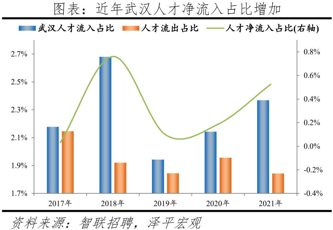 从来源看,人才向武汉流入的前十大城市分别为北京、石家庄、深圳、郑州、上海、西安、长沙、广州、黄冈,合计占比达38.3%,高于2020年的37.5%。人才流入武汉原因主要因为2017年开始实施“百万大学生留汉创业就业工程”吸引毕业生,包括给大学生提供低于市场价20%的安居房或租赁房、放宽落户条件、规定指导性最低年薪标准等政策。2021年武汉成立人才集团有限公司,专门为城市引进人才,并且武汉继续放宽落户条件,接近“零门槛”,落户开放度在国家中心城市中最大。作为在校大学生数量全国第三的城市,武汉人才流入明显增加。2021年新增留汉大学生34.5万人,超额完成“学子留汉”工程计划,达到历史最好水平。从去向看,武汉人才外流的前十大城市分别为北京、深圳、上海、广州、杭州、成都、长沙、襄阳、南京、苏州,合计占比达43.9%,高于2020年的42%。