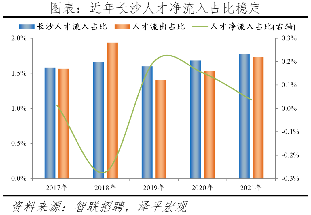 6)长沙:2017-2021年人才净流入占比分别为0.0%、-0.3%、0.2%、0.2%、0.04%,占比较稳定,人才流入主因长沙生活成本低、文娱产业繁荣。从人才流入流出看,2019-2021年长沙人才流入占比从1.6%增至1.8%,人才流出占比从1.4%增至1.7%,长沙人才流动性增加,整体人才净流入占比保持稳定,近三年为正。