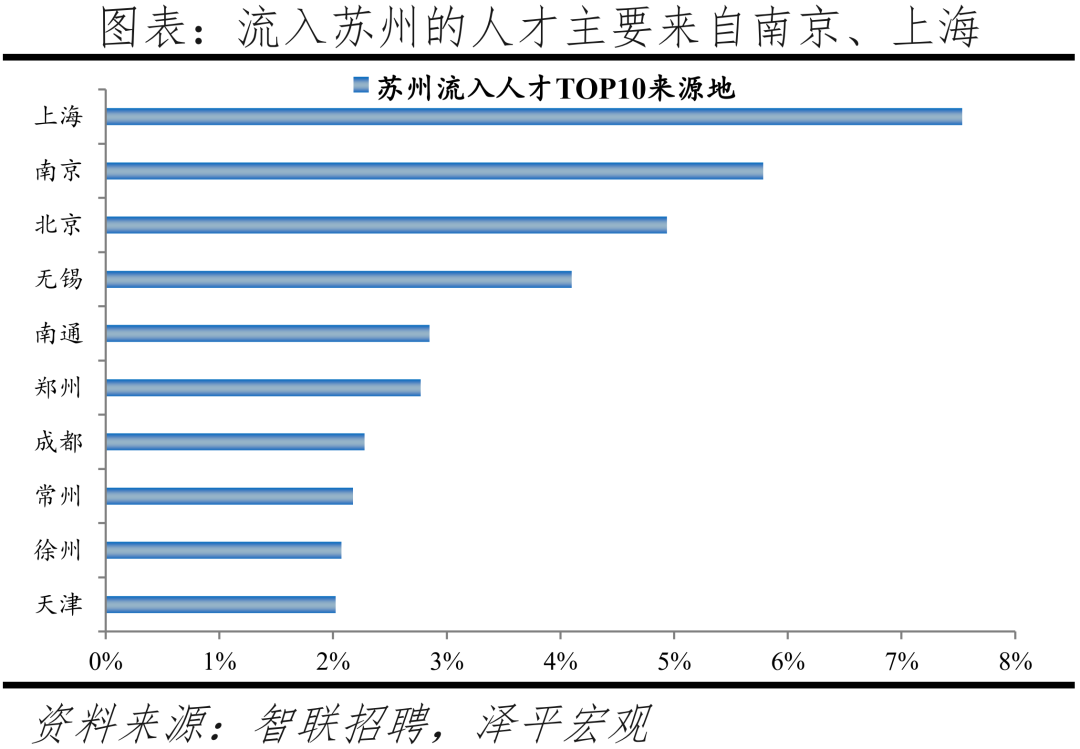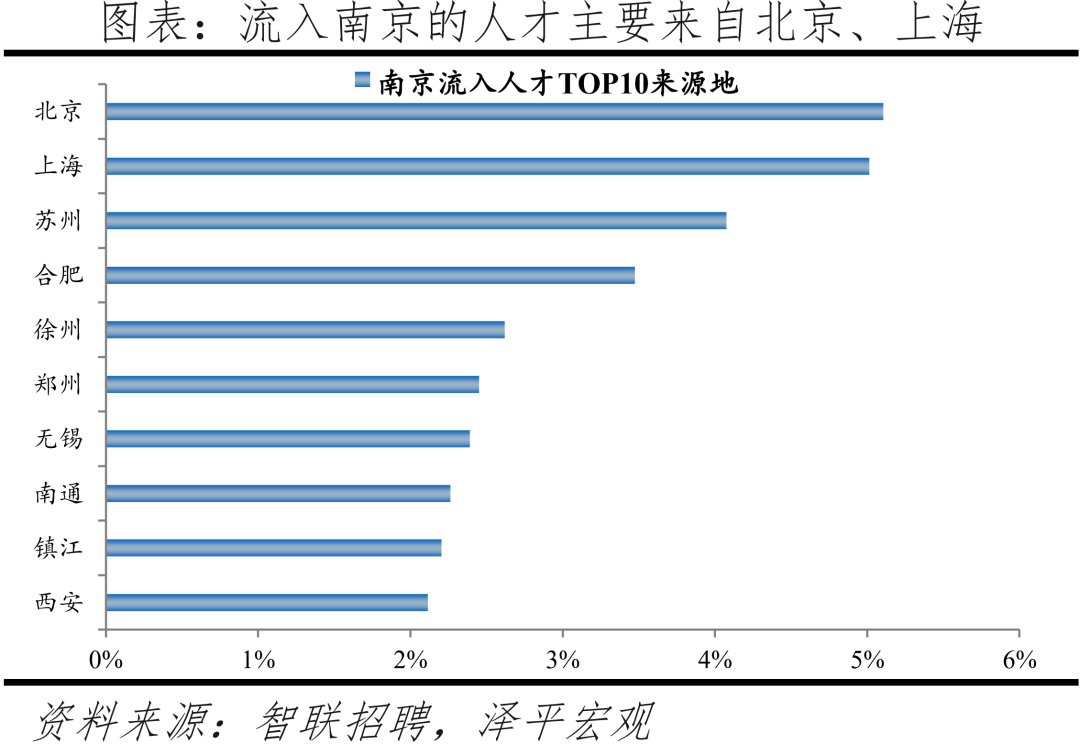 从来源看,人才向南京流入的前十大城市合计占比达31.7%。其中,有6个是长三角地区,合计占比达22.3%。人才流入南京主因其高端产业发展迅速、落户政策宽松。2021年南京高新技术产业产值同比增长16.6%,进入“快车道”。2018年“宁聚计划”即《人才落户实施办法》实施,不再以就业为落户前提,年龄条件也从35岁放宽到40岁。2018-2020年南京户籍人口每年增量均超过10万人。从去向看,南京人才外流的前十大城市合计占比达49.2%。其中,有8个是长三角地区,合计占比达40.3%。南京和长三角的人才互动非常频繁,部分因为南京高校较多,长三角人才为求学向南京集聚,毕业后从南京回流至长三角其他城市。根据教育部数据,南京普通高校数、211高校数分别为37、12所,分别排名第5、3名。