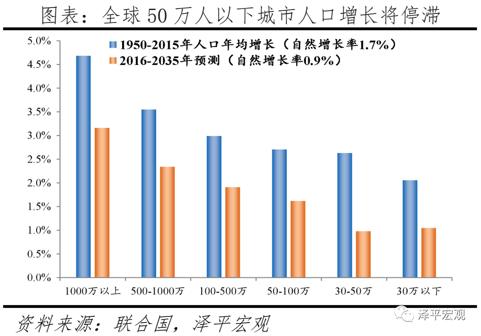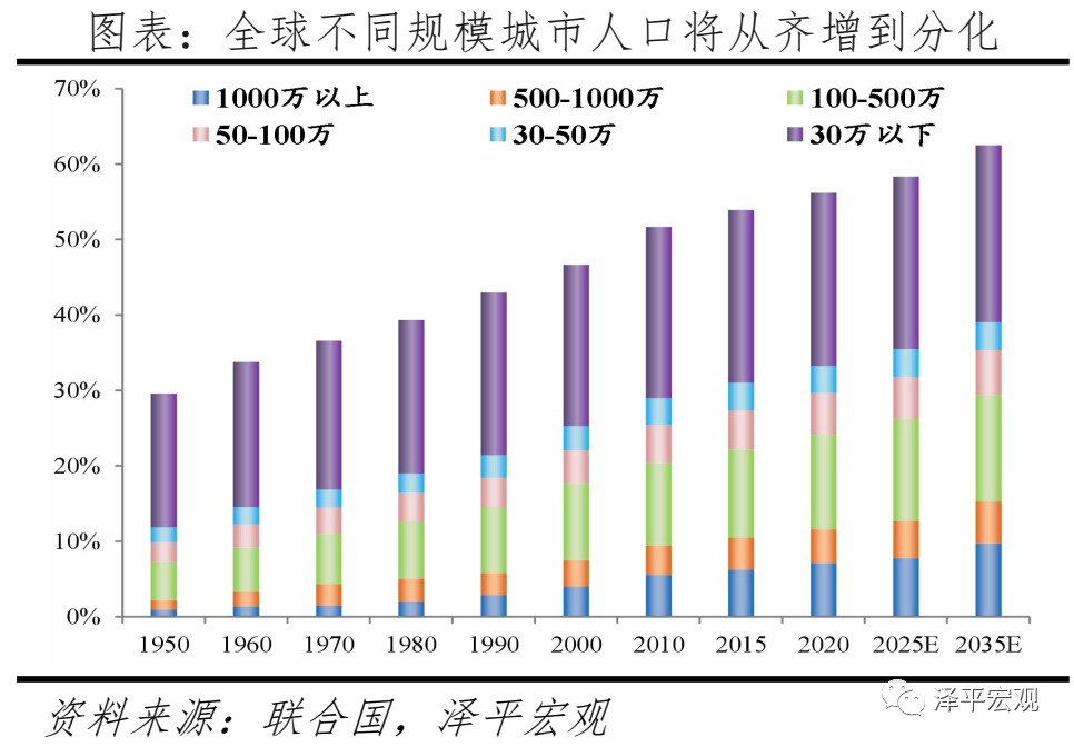 全球人口迁移呈现两大特点:一是跨国层面,人口从中等、低收入国家向高收入国家迁移。1960-2020年,高收入经济体人口净流入规模累计1.4亿,来自中高、中低、低收入经济体的比例分别为26.4%、50.0%、27.1%。中高收入经济体人口生活水平接近高收入经济体,迁移动力不强;低收入经济体人口迁移动力强,但难以承担迁移成本;中低收入经济体人口迁移动力强,且能承担迁移成本。二是城乡层面,人口从乡村和中小城市向一二线大都市圈迁移。1950-2020年,全球城市化率从29.6%增至56.2%,该时期所有规模城市的人口占比均明显上升,人口年均增速均明显超1.7%的自然增长水平。其中,1000万人以上城市人口占比从0.9%增至7.1%,30万人以下小城市人口占比从17.8%升至22.9%,分别上升6.2、5.1个百分点。根据联合国预测,2035年全球城市化率达62.5%,大城市和大都市圈人口继续快速集聚,但50万人以下城市人口年均增速将降至1%、略高于0.9%的自然增长水平。