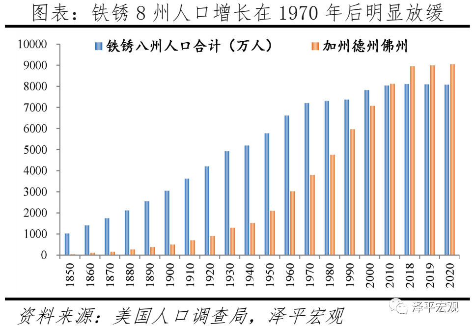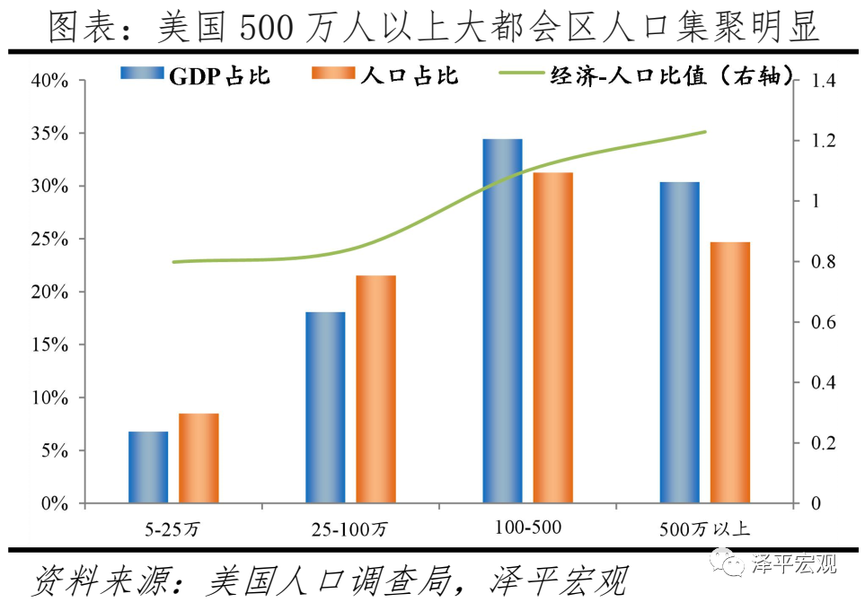 美国人口迁移呈现两大特点:一是地区层面,从向传统工业主导的五大湖区集聚,到向能源、现代制造和现代服务业主导的西、南海岸集聚。1850-1970年,美国铁锈8州人口从1023万增至7203万。1970年代开始,伴随着西欧、日本以及中国崛起,美国传统制造衰落,铁锈8州GDP占比从1970年的35.6%降至2020年的24.8%。与经济衰落对应的是,1970年以来铁锈8州人口增长大幅放缓,到2020年仅增加937万至8140万,占比大幅降至25%。而以能源、先进制造和现代服务业为主的加州德州佛州逐渐成为人口集聚中心。1850-1970年,三州人口从40万增至3794万人,占比从1.7%升至18.6%。1970-2020年,三州GDP份额从18.1%增至29.1%,人口快速增至9022万,占比升至27.3%。1970年和2020年,铁锈8州、加州德州佛州三州的经济-人口比值基本在1附近。二是城乡层面,在城市化中后期明显向大都会区集聚。1970-2019年,美国500万人以上都会区人口比重增加9.5个百分点,远高于100-500万、25-100万、5-25万人都会区的5.8、1.2、0.1个百分点。2019年美国5-25万、25-100万、100-500万、500万人以上都会区经济-人口比值分别为0.8、0.8、1.1、1.2,大都会区依然对人口有较大吸引力。