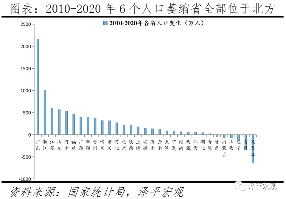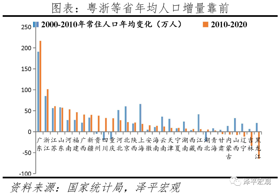 人口持续向南方、东部地区集聚,2010-2020年南方、北方年均常住人口增量分别为655.0万、114.6万人。分南北看,2000-2020年北方GDP占比从41.8%快速降至35.2%,南北经济总量差距从16个百分点迅速扩大至30个百分点,2014年开始,北方人均GDP低于南方。2020年人均GDP前10强城市,除北京外皆在南方(不含资源类城市)。与北方经济衰落对应的是,人们用脚投票,奔向南方。2000-2010年南方、北方年均常住人口增量分别为506.2万、395.8万人,2010-2020年南方、北方年均常住人口增量分别为655.0万、114.6万人,南方年均增量多于北方,2000-2020年南方、北方人口占比分别由58.1%、41.9%变为59.4%、40.6%。分地区看,2000-2010年东部人口占比上升2.38个百分点,中部下降1.07个百分点,西部上升0.96个百分点,东北下降0.22个百分点;2010-2020年东部人口占比上升2.01个百分点,中部下降0.9个百分点,西部上升0.41个百分点,东北下降1.23个百分点,东部人口占比持续上升。