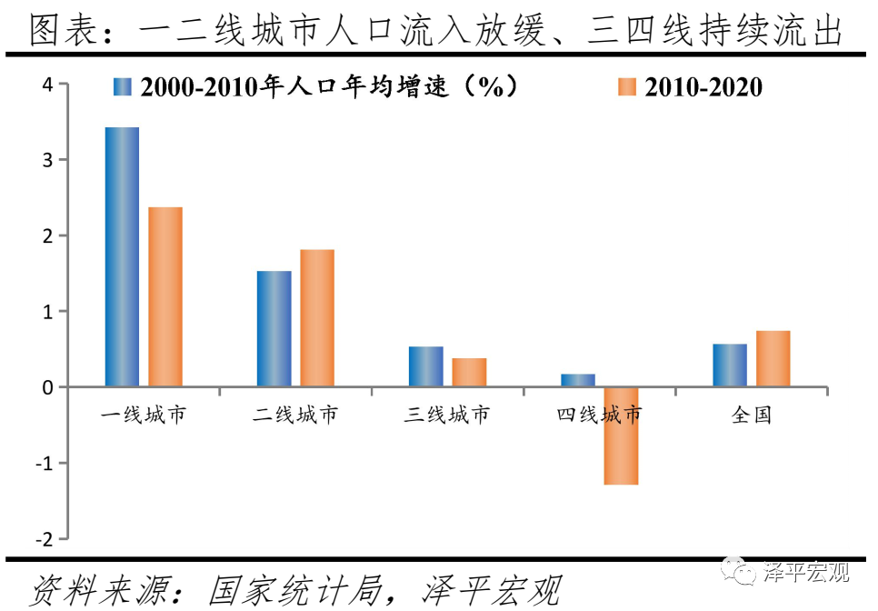 从全域层面看,近10年一线城市人口年均增速为2.37%,人口持续流入但增速放缓;二线城市人口年均增速为1.91%,人口持续流入且增速小幅上升;三、四线城市人口年均增速为0.43%、-0.45%,人口持续流出。根据GDP、城镇居民人均可支配收入、以及城市政治地位等,我们将地级及以上单位划分为一、二、三、四线城市。总体来看,2000-2020年一线、二线城市人口占比分别由3.7%、19.31%增至5.88%、24.39%,三、四线城市则由30.87%、42.98%降至30.50%、37.06%。从趋势看,2000-2010年、2010-2020年,全国人口平均增速分别为0.57%、0.53%,一线城市人口年均增速分别为3.42%、2.37%,一线城市人口保持集聚,但增速持续放缓;上述两个时期,二线城市人口年均增速分别为1.53%、1.91%,人口持续流入且增速小幅上升。此外,上述两个时期,三线城市人口年均增速分别为0.53%、0.43%,略低于全国平均增速;四线城市仅为0.16%、-0.45%,明显低于全国平均水平,表明三、四线城市人口仍持续流出。