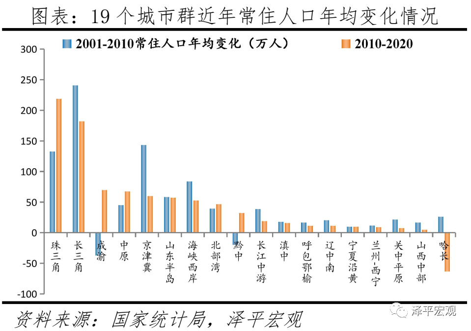 近10年珠三角、长三角城市群年均常住人口增量超180万人,成渝、中原城市群年均常住人口增量超65万人,但东北、西部等区域近年面临产业结构单一,呈现人口流出趋势。中国“十三五”规划提出建设长三角、珠三角、京津冀、山东半岛等19个城市群。总体看,人口、经济已高度集中于19个城市群,近年愈发向核心城市群集聚。2000-2020年,全国19个城市群土地面积占全国39.59%,其常住人口占比由83.37%提升至86.72%。除2010-2020年天山北坡城市群数据缺失外,2000-2010年、2010-2020年常住人口年均增加值为正的城市群分别为16、17个。近10年年均常住人口增量前五的城市群分别是珠三角、长三角、成渝、中原、京津冀。具体看,全国经济最活跃的珠三角、长三角城市群土地面积仅占全国2.92%,2000-2020年常住人口合计占比由13.83%提升至18.05%;2000-2010年,珠三角、长三角城市群年均常住人口增量分别为132.5万、240.8万人,2010-2020年珠三角、长三角城市群年均常住人口增量分别为281.9万、181.9万人。上述两个时期成渝城市群年均常住人口增量由-37.34万变化为69.5万人。但近10年东北、西部等区域近年面临产业结构单一、经济转型缓慢等问题,呈现人口流出趋势,上述两个时期,哈长城市群年均常住人口增量分别为26.2万、-63.2万。