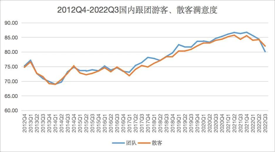 图 5 2012-2022 年国内跟团游客和散客满意度趋势图