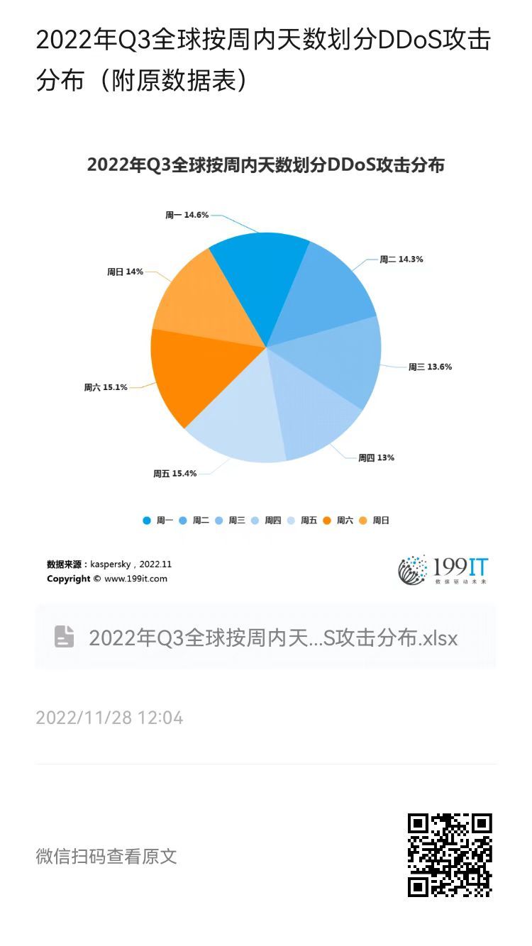 2022年Q3全球按周内天数划分DDoS攻击分布(附原数据表) 更多阅读:2022年Q3全球主要国家DDoS攻击分布(附原数据表) 2022年Q2全球主要国家DDoS攻击分布(附原数据表) 2022年Q3全球主要国家DDoS攻击分布(附原数据表) 2022年Q3全球各类型DDoS攻击分布(附原数据表) Securelist:2017年Q3全球DDoS攻击情况汇总卡巴斯基实验室:2019年第二季度DDoS攻击数量下降44%卡巴斯基实验室:2018年Q3全球DDoS攻击情况汇总卡巴斯基实验室:2018年第二季度DDoS攻击情况汇总卡巴斯基实验室:2022年第三季度DDoS数字汇总Akamai:2021年针对网游行业的网络攻击增长167%Cloudflare:2025年DDoS攻击峰值达7.3Tbps卡巴斯基实验室:2020年第三季度 DDoS攻击报告卡巴斯基实验室:2020年第二季度DDoS攻击数字汇总卡巴斯基实验室:2019年第三季度DDoS攻击概况卡巴斯基实验室:2019年Q1全球近60%的DDoS攻击的目标是中国