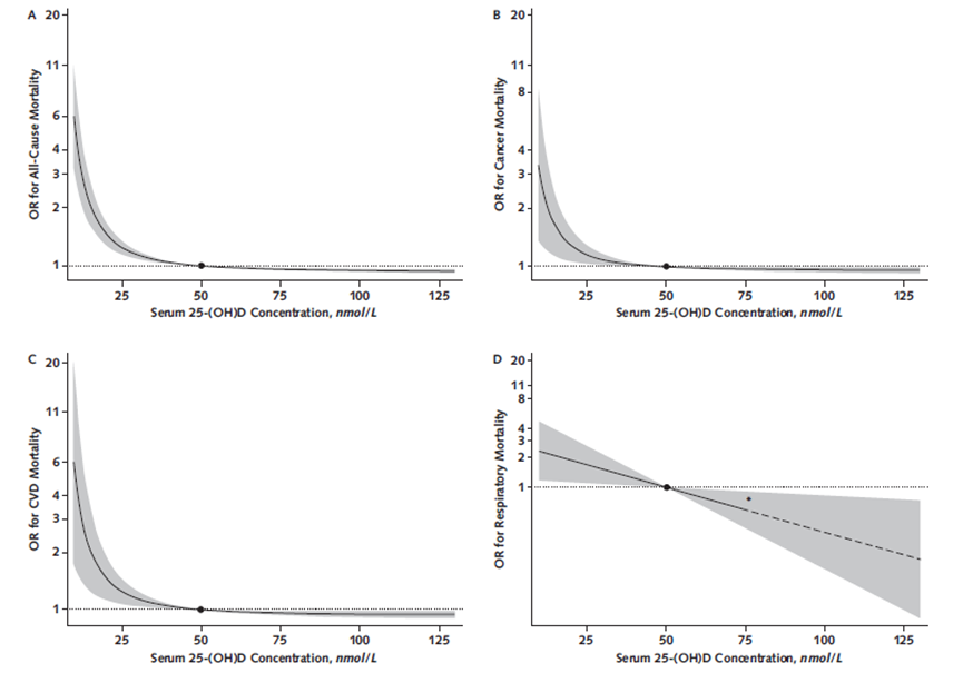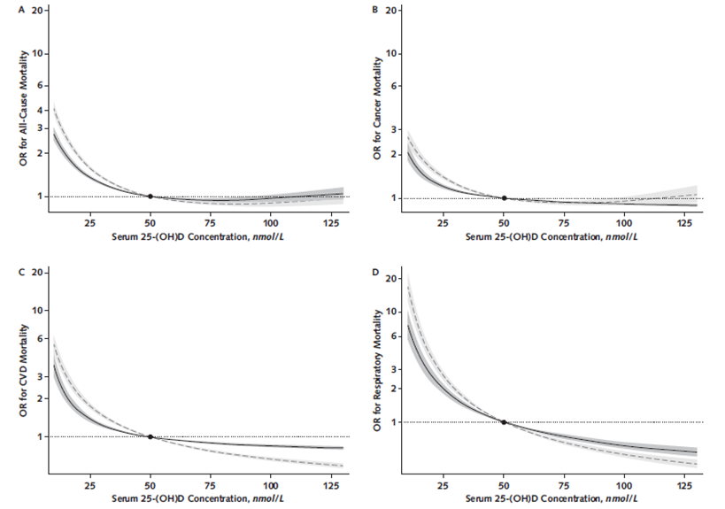 25-(OH)D血清浓度与全因、癌症、心血管疾病和呼吸系统疾病死亡率的优势比(OR)关系均呈现出,25-(OH)D水平低于25 nmol/L,即维生素D缺乏状态时,死亡风险显著升高。
