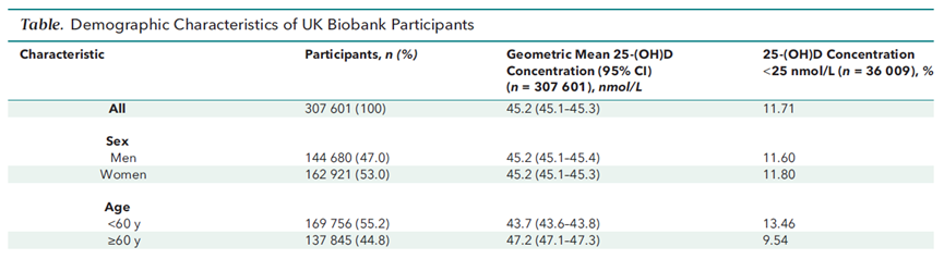 首先,研究人员利用大规模且具前瞻性的英国生物样本库(UK Biobank),从502521人中选取了307601名年龄在37-73岁间,且具有25-羟基维生素D (25-(OH)D)数据的欧洲白人血统参与者作为研究对象。