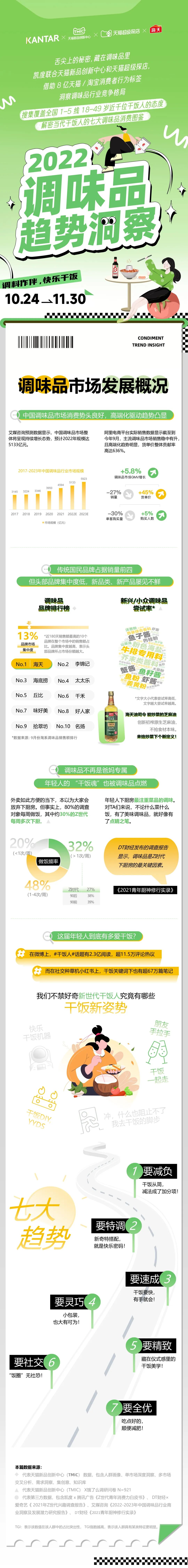 TMIC:2022年调味品趋势洞察 本次搜集覆盖全国一至五线的近千位“干饭人”。研究发现,中国调味品市场消费势头良好,且高端化驱动趋势凸显。传统国民品牌占据销量前四,但头部品牌集中度低,新品类、新产品拥有极大潜力。 “干饭人”究竟有哪些干饭“新姿势”?七大调味品消费图鉴如下👇 来源:凯度(ID:KantarGroup 更多阅读:TMIC:2022酱香酒趋势报告TMIC:2022电解质饮料趋势Nature:携带相同基因组的癌细胞或许会表现出不同的行为!自如研究院:2021年10城毕业生租房报告国际顶刊《PNAS》:爱发朋友圈的人,更容易长寿在中国,只抓一个权健是不够的途虎养车:2018中国汽车用户线上养护行为报告世界各城市60平米房屋成本心理学研究:名字刻板印象可潜移默化影响面部外貌研究显示:山西黄糕支链淀粉含量高,黏性源于1.88%~2.97%直链淀粉工信部:2026年春节9天移动流量878.3万TB,同比增长18.7%马里兰大学:新研究显示健康成年人日均放屁32次Educate 360:2026年劳动力技能与趋势报告重写规则:家族办公室在新世界秩序中前行皮尤研究中心:调查显示18%青少年智能手机用户使用地理位置服务