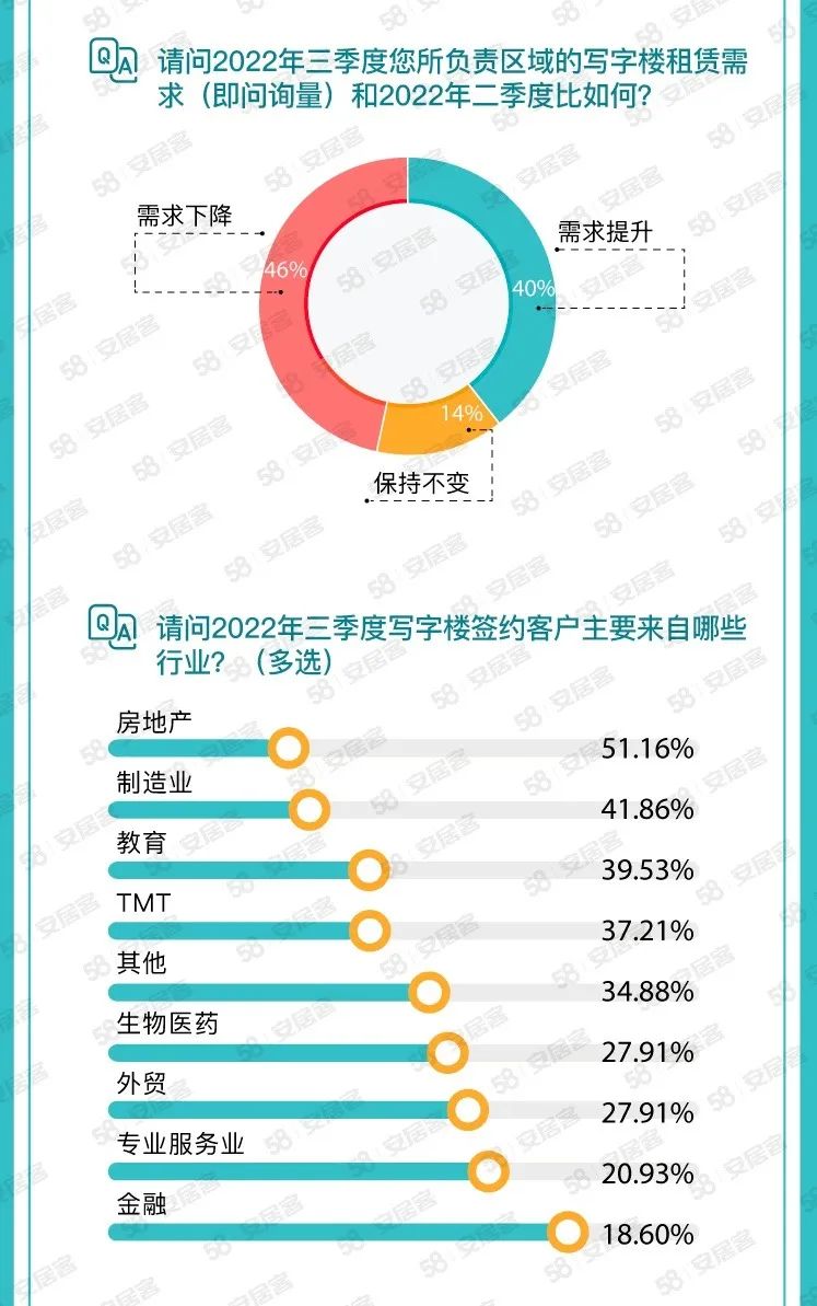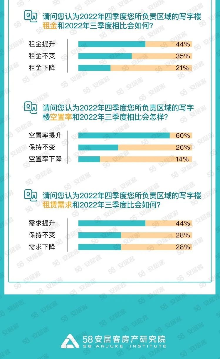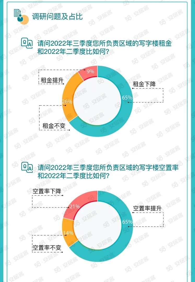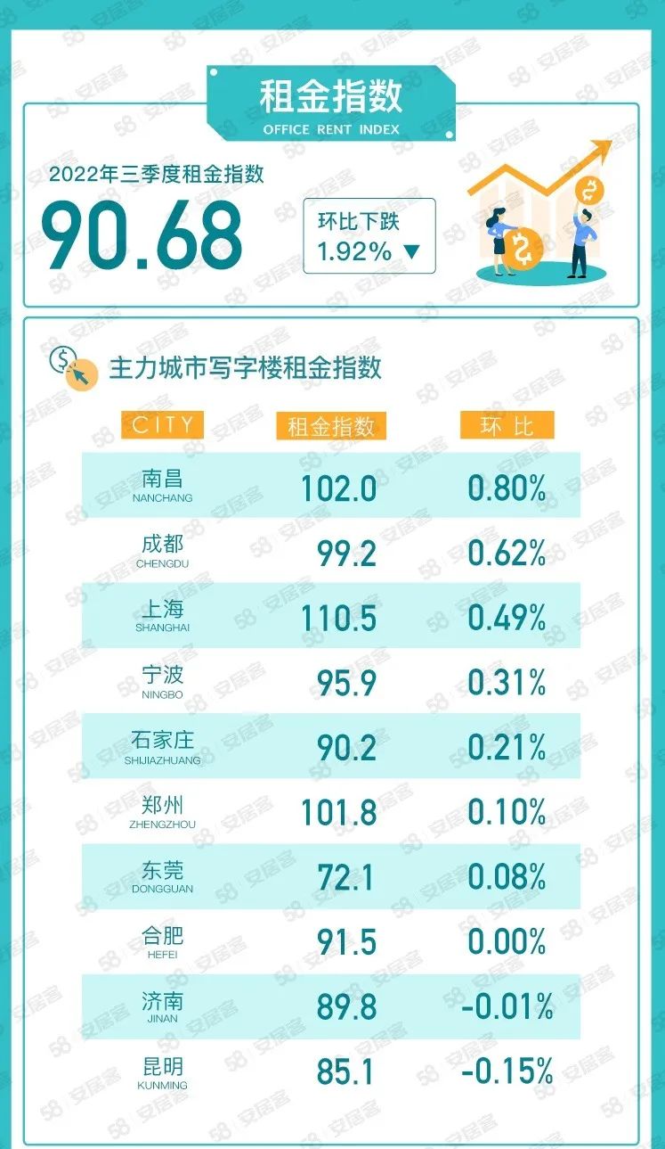 2022年三季度,三十个大中城市写字楼租金指数为90.68,环比上季度下跌1.92%。相比上季度,各地写字楼租金挂牌价下调幅度有所缓和,业务延续以价换量策略减少空置率。写字楼租金指数南昌上升0.80%,成都和上海各上升0.62%及0.49%。(注: 以上数据根据58同城、安居客在线挂牌价计算得出。)