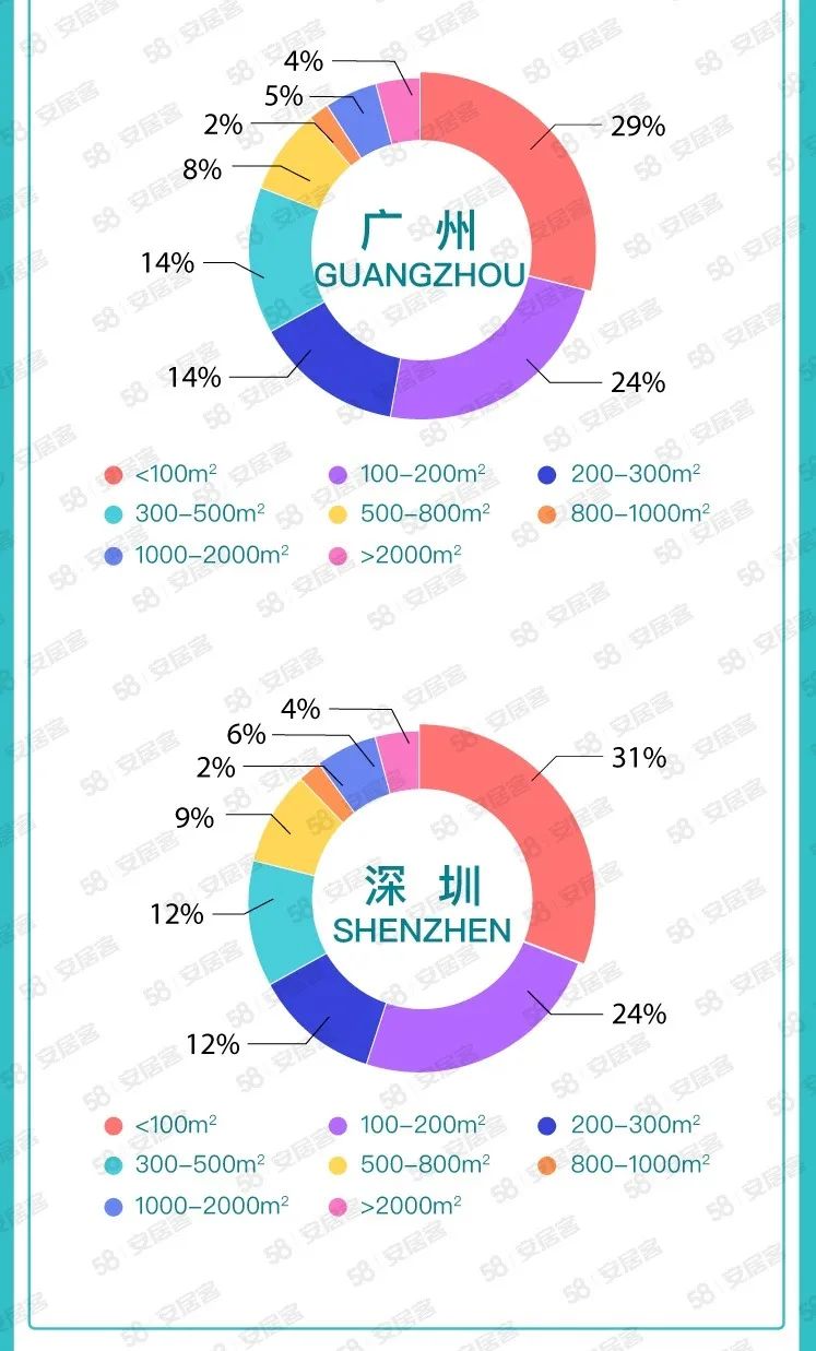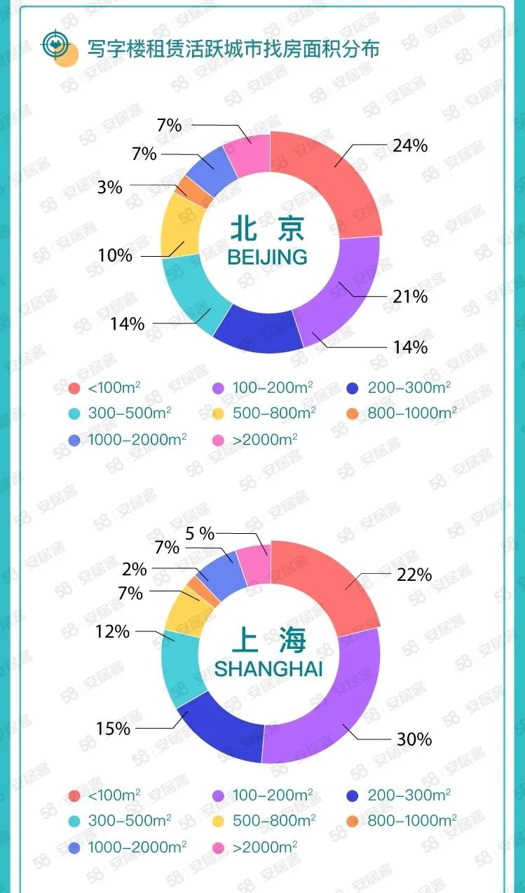 与上季度相比,北京各面积段搜索占比变化不大,上海变化较明显,小面积写字楼特别是<100平米的单位搜索量从上季度的19%上升至本季度的22%,100-200平米的单位搜索量从28%上升至30%,与之对应大面积写字楼搜索量占比减少,尤其是>1000平米的单位。从上季度的10%下降至5%。
