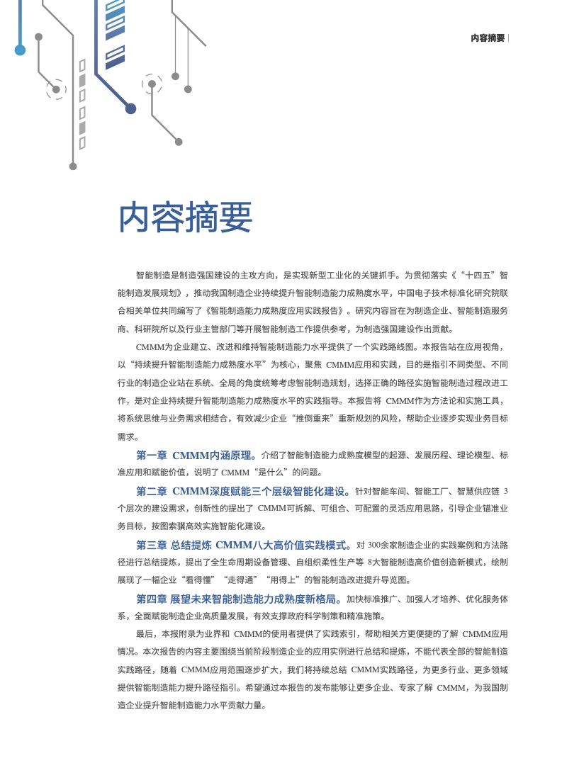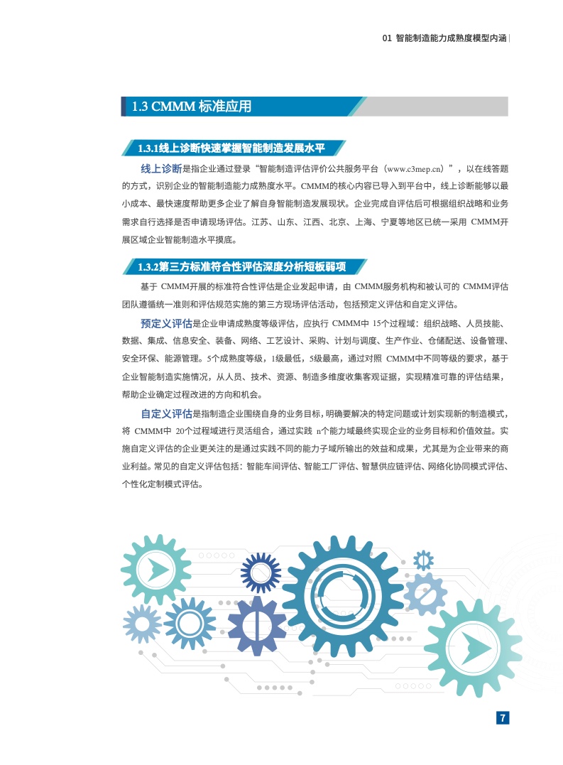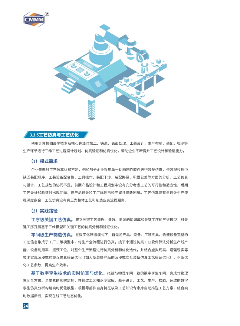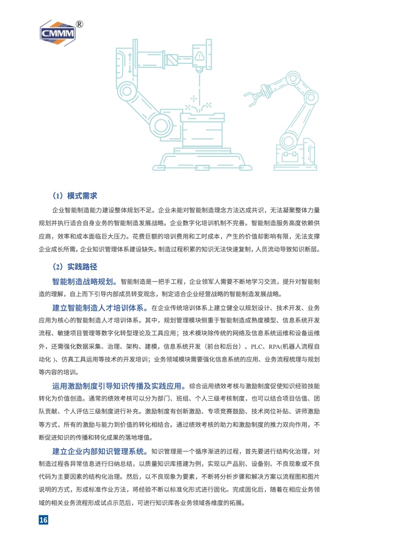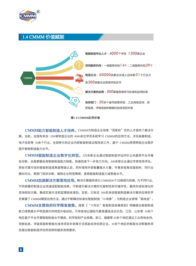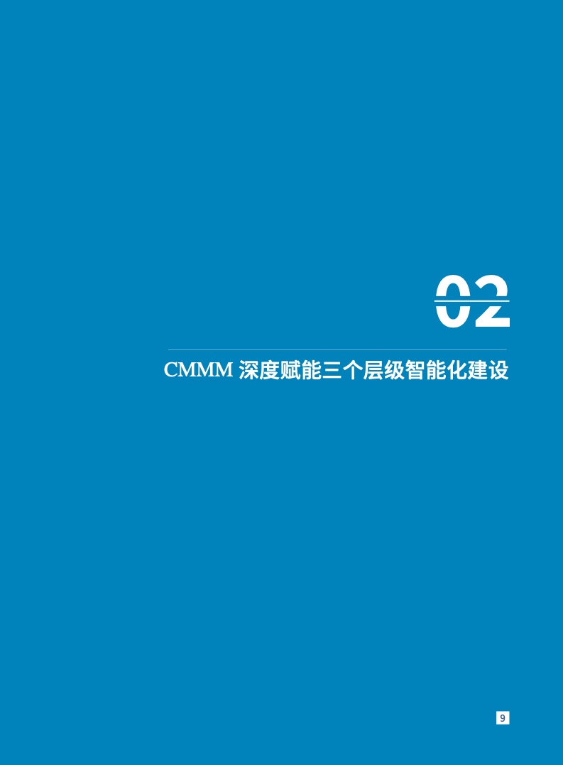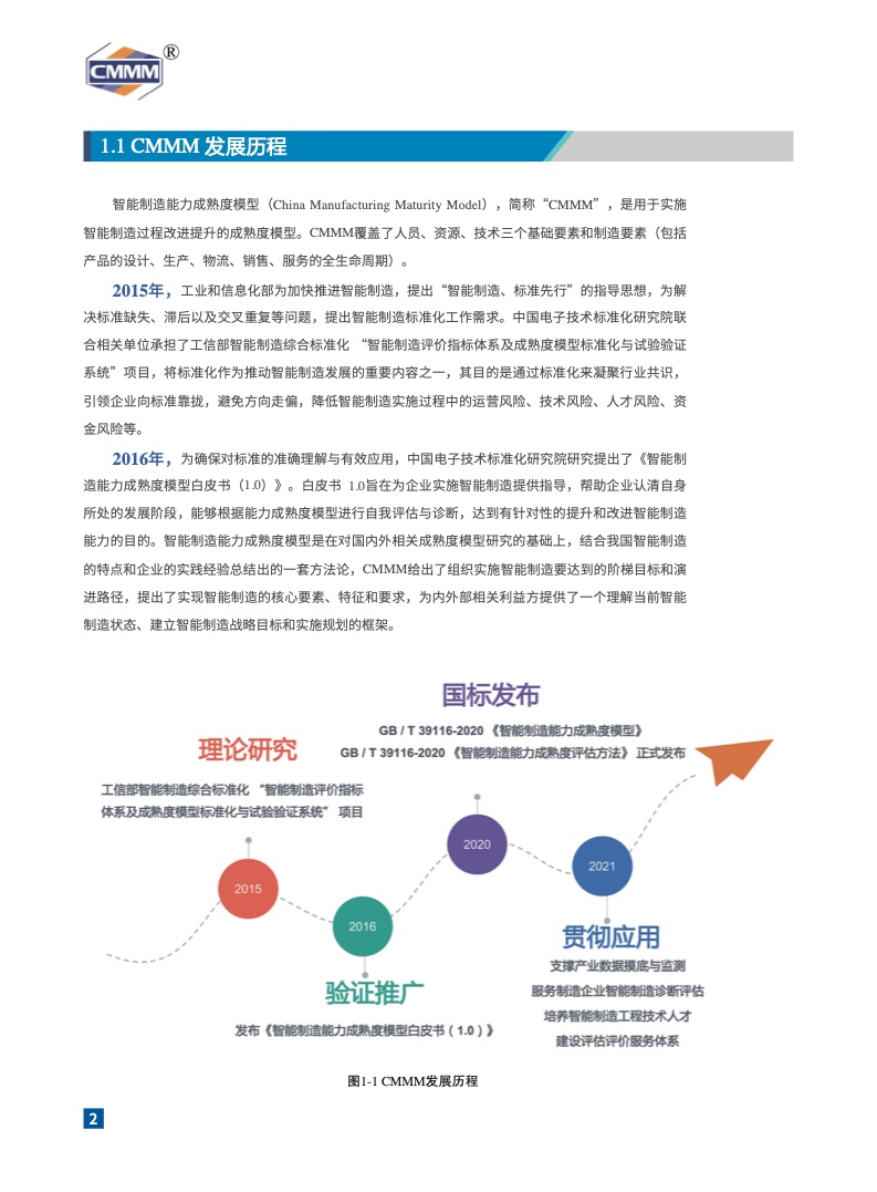 为贯彻落实《“十四五”智能制造发展规划》,推动“制造企业智能制造能力成熟度水平明显提升”转型升级目标,中国电子技术标准化研究院将广泛联合业界同仁,共同推动CMMM落地应用,支撑全国开展CMMM评估,持续总结 CMMM实践路径,为更多行业、更多领域提供智能制造能力提升路径指引,为企业绘制 “看得懂”“走得通”“用得上”的智能制造改进提升导览图。望通过本报告的发布能够让更多企业、专家了解 CMMM,为我国制造企业提升智能制造能力水平贡献力量。