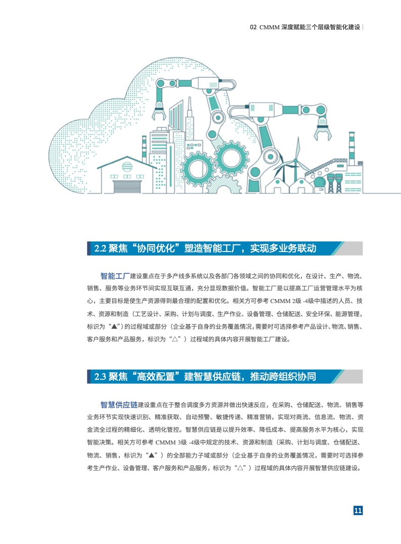 CMMM 2.0以灵活应用CMMM为主题,创新性的提出了CMMM是可拆解、可组合、可配置的柔性模型。从企业应用视角出发,阐述了CMMM的内涵原理和应用价值,指引不同类型、不同行业的制造企业站在系统、全局的角度统筹考虑智能制造规划,选择正确的路径实施智能制造过程改进工作,对企业持续提升智能制造能力成熟度水平提供理论参考。基于智能车间、智能工厂、智慧供应链三个层级的建设需求,提出CMMM深度赋能智能制造工程建设思路,引导企业锚准业务目标,按图索骥高效实施智能化建设。