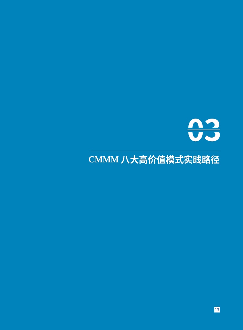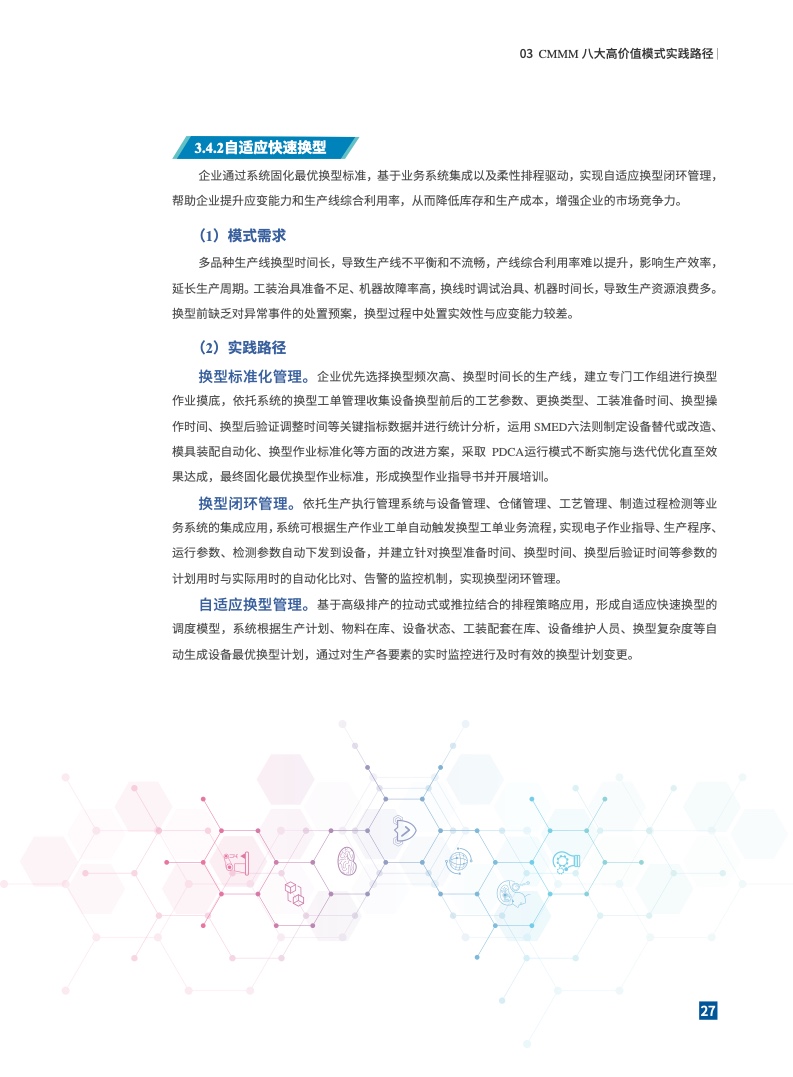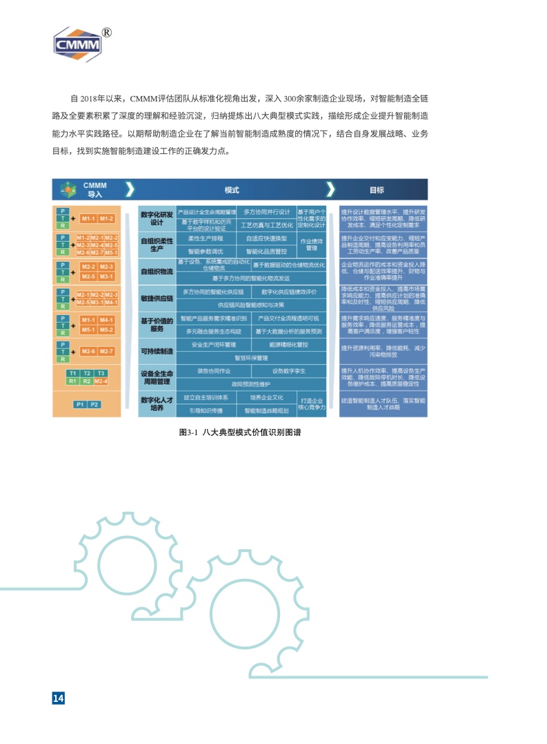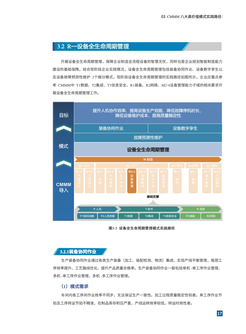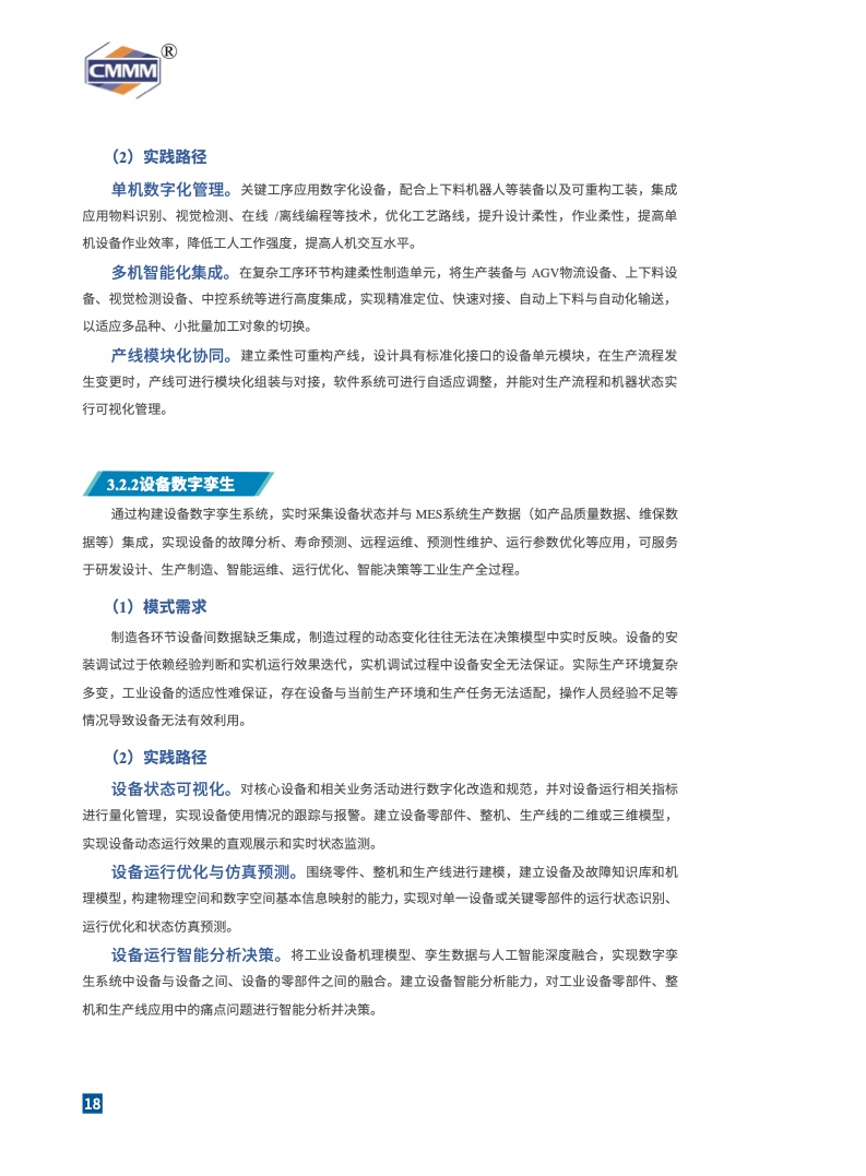CMMM 2.0中凝结了300多家制造企业的实践经验和方法路径,提出了当前阶段制造企业重点实施的设备全生命周期管理、自组织柔性生产、可持续制造等八大高价值实践模式,给出了不同模式的实践路径,对企业持续提升智能制造能力成熟度水平提供实践指导。