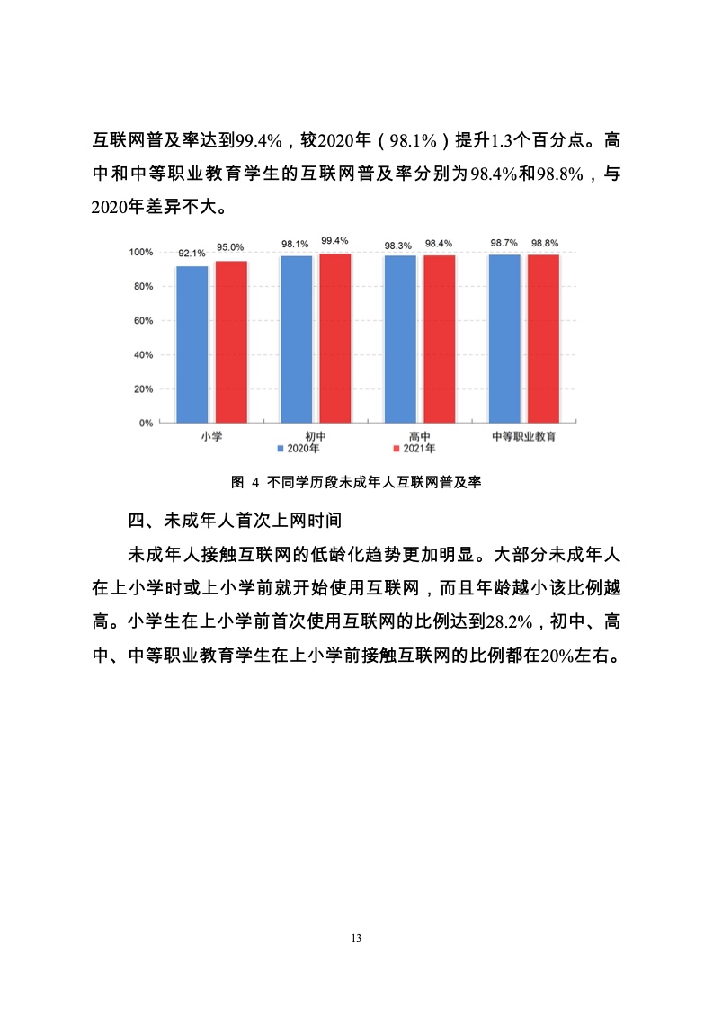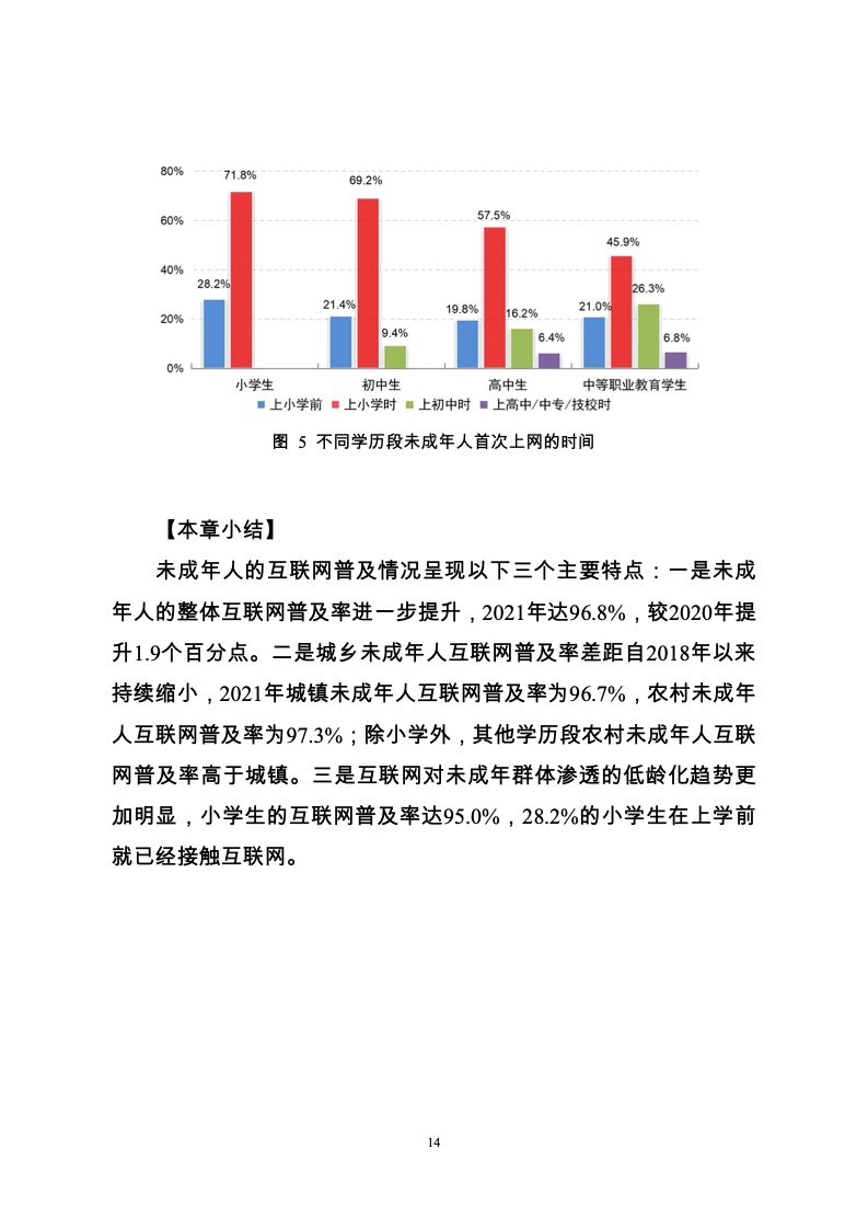 2021年我国城镇未成年人互联网普及率为96.7%,农村未成年人互联网普及率为97.3%;小学阶段,城镇未成年人互联网普及率比农村高0.8个百分点,初中开始,农村未成年人互联网普及率略高于城镇。