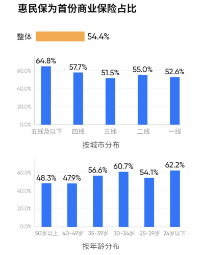 《报告》显示,在现有惠民保用户中,有54.4%的用户购买的第一份商业保险就是惠民保,这表明,惠民保对保险市场有一定的教育意义。这个趋势尤其在下沉市场中更为明显,在五线及以下城市的惠民保用户中,有64.8%的用户是首次购买商业保险。