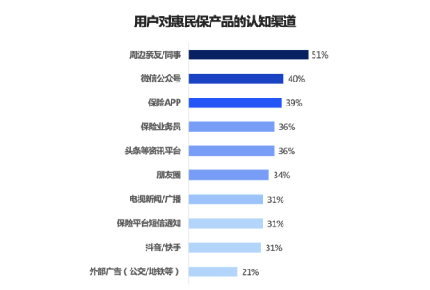 《报告》显示,惠民保的认知渠道TOP 5 为:周边亲友/同事、微信公众号、保险APP、保险业务员和头条等资讯平台。