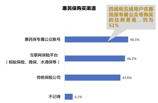 水滴调研数据显示,有48%的用户通过惠民保专属公众账号购买,四线及以下城市用户通过此渠道购买的比例更高,约为51%;另有46.2%用户通过蚂蚁保险、微保、水滴保等互联网保险平台进行购买。