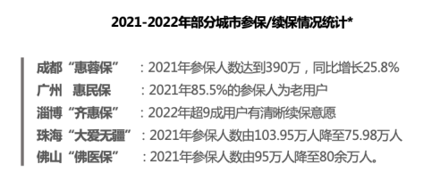 “惠民保”参保率持续提升,2021年上市的项目参保率为9.1%,较2020年整体4.2%的参保率提高4.9个百分点,同比增长116.67%。具体来看,各地续保情况有升有降,存在较显著差异,有部分产品因保障条款设置创新力不足、宣传力度不足等因素,续保率存在下降现象。也有部分城市通过不断调整产品保障力度,提升续保率。