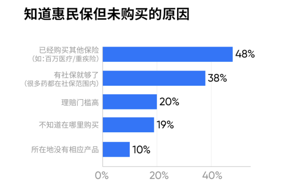在未购买惠民保的用户中,近一半用户是因为已经购买了百万医疗、重疾险等其他保险,还有近四成用户认为“有社保就够了”,20%的用户认为理赔门槛较高。此外,有19%的用户不知道在哪里购买惠民保产品,以及有10%的用户所在地没有相应的惠民保产品。