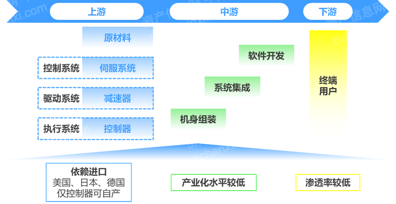 手术机器人的上游主要是制造手术机器人的原材料,以及内部控制系统、驱动系统和执行系统的核心伺服系统、减速器、控制器。然而我国手术机器人行业上游的三大核心零部件仅有控制器可实现自产,伺服系统和精密减速器仍以进口为主,成为手术机器人领域的 “卡脖子环节”,并且短时间内仍然难以与国际顶尖企业比肩,同时这也是整个机器人行业最难攻克的技术难题。