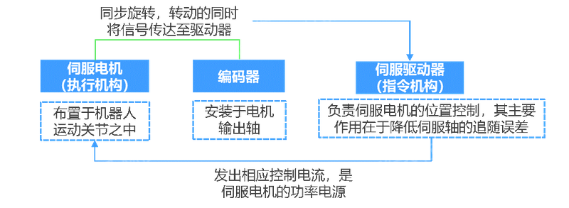 伺服系统由伺服电机、编码器和伺服驱动组成,主要为机器人的运动提供动力并完成机器人运动。伺服系统是一种以机械位置或角度作为控制对象的自动控制系统,除了可以进行速度与转矩控制外,还可以进行精确、快速、稳定的位置控制。