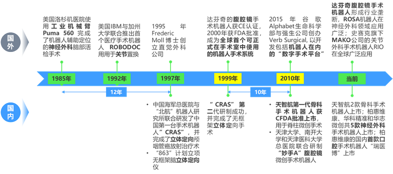 80 年代末,斯坦福大学研究院是最早进行外科手术机器人研发的机构,此后在 1992 年由 IT 公司 IBM 和加州大学联合推出了全球首个医疗手术机器人 ROBODOC 用于骨科手术中的关节置换。到 1995 年,出身于斯坦福大学研究院的 Frederic Moll 博士创立了当今全球最为出名的医疗手术机器人公司——直觉外科公司(Intuitive Surgical),并开启了手术机器人领域的商业化道路。而此时的中国才刚刚开始在手术机器人领域的探索,研发制造进度较美国滞后了十年以上。1999 年全球首个可正式应用于手术室中的手术机器人系统达芬奇手术机器人率先在欧洲获批上市,这是一款由美国直觉外科公司研发制造的腹腔镜手术机器人。