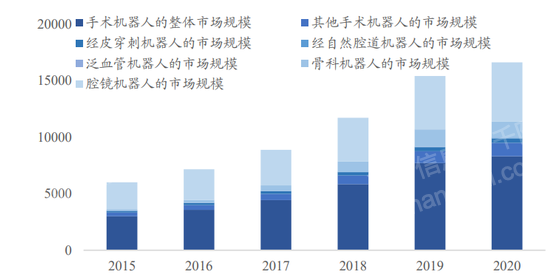 全球手术机器人市场增长快速,腔镜机器人占比最大。全球手术机器人市场规模从 2015 年 30.10 亿美元快速增长至 2020 年的 83.21 亿美元,年复合增长率为 22.6%。其中,腔镜机器人占比较大,可用于多种手术包括泌尿外科、妇科、胸外科及普外科手术等。据数据统计,其市场规模从 2015 年 23.84 亿美元上升至 2020 年 52.55 亿美元,占比 63.15%。其他类型手术机器人中,骨科机器人这一市场规模增长也很迅速,在 2015 年仅有 1.38 亿美元,而经皮穿刺机器人市场规模有 1.58 亿美元,到了 2020 年骨科机器人增长至 13.94 亿美元超过经皮穿刺机器人 3.80 亿美元规模,其需求受人口老龄化和关节炎患病率的不断提升带动,发展潜力巨大。