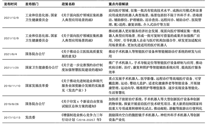 手术机器人作为我国医疗领域重点新兴产业,近年来国家有关部门陆续出台一系列相关政策文件,推动我国手术机器人行业的发展,为行业提供了良好的政策环境。例如 “十三五” 以来,“十三五规划”倡议大力发展手术机器人,支持手术机器人上游零部件的精细化自主开发,并推广人工智能技术在各个领域的商业应用,为国内机器人实现自主创新及研发奠定重要基础。