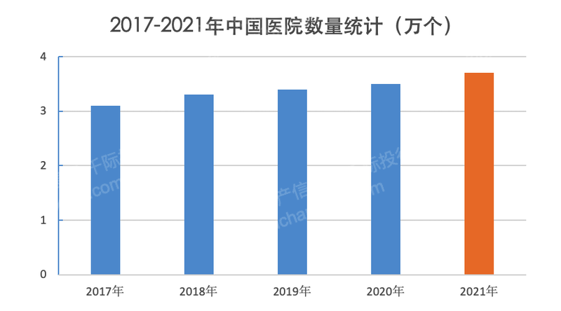 近年来,我国医院数量稳步增加,总体保持在 3 万个以上。2021 年中国医院 3.7 万个,比上年增加 0.2 万个。其中,公立医院 1.2 万个,民营医院 2.5 万个。