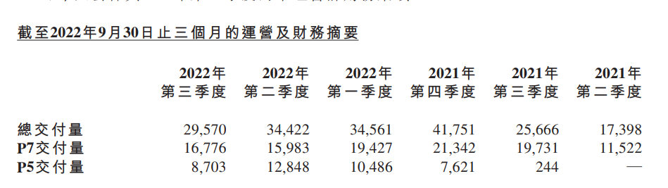 第三季度,小鹏汽车交付量达 29570 辆,同比增长 15%;智能运动型轿车 P7 的交付量为 16776 辆,较 2021 年同期的 19731 辆减少 15%。2022 年第三季度智能家庭型轿车 P5 的交付量为 8703 辆。