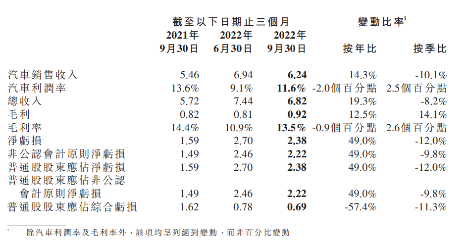 2022 年第三季度汽车销售收入为人民币 62.4 亿元(8.8 亿美元),较 2021 年同期上升 14.3%,较 2022 年第二季度减少 10.1%。