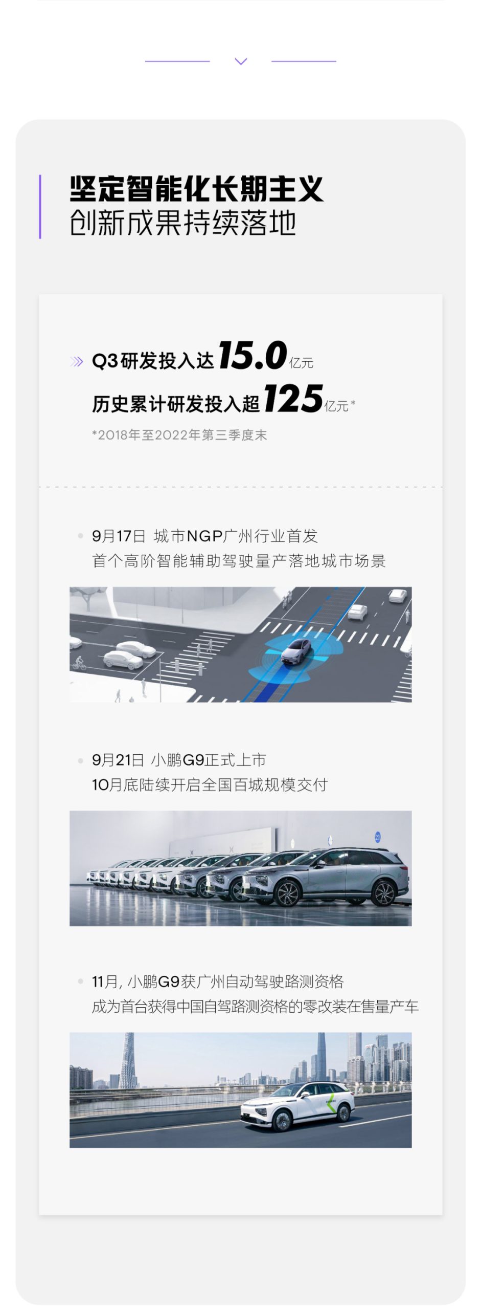 截至 2022 年 9 月 30 日,小鹏汽车自营充电站网络进一步扩展至 1011 座充电站,包括 806 座小鹏汽车自营超级充电站及 205 座目的地充电站。