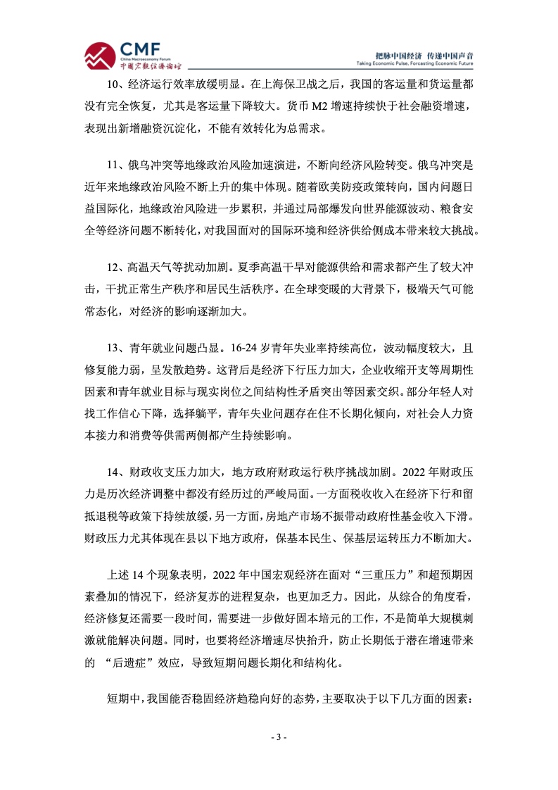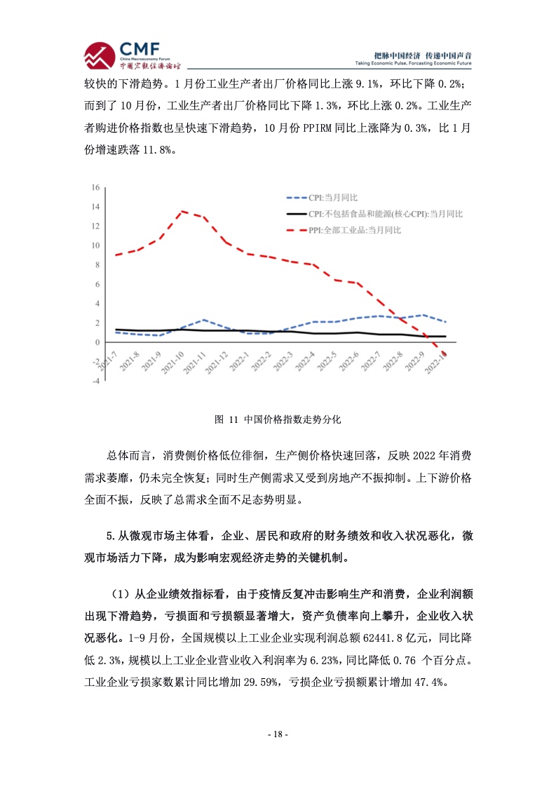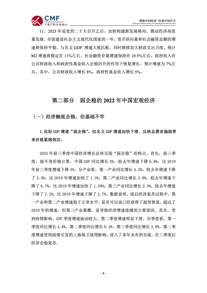 报告指出,2022年在“三重压力”和超预期冲击叠加下,中国宏观经济实现了弱企稳。弱企稳态势来之不易,对疫情防控的进一步的优化、积极有效的政策托底和国内完整产业链与超大市场的支撑,共同应对了超预期冲击,尤其是疫情对经济的扰动。报告认为,疫情对中国经济下行有很强的放大作用,但疫情并不是中国经济下行的本质原因。中国经济下行的本质问题是总需求收缩和信心不足。在总需求收缩中,今年最显著的特征是房地产的深度调整,深度调整向上延伸到钢铁、建材等行业,向下延伸到消费行业比如家具、家电,即使剔除掉房地产的深度调整,消费也疲弱。因此,2022年宏观经济在消费持续疲弱的底色下,叠加了周期性的房地产下行以及超预期冲击等问题影响,又通过一系列的努力实现了中国经济的弱企稳。