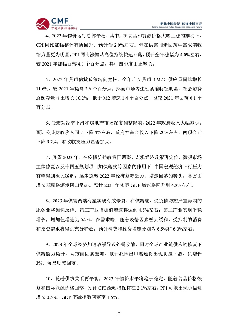 报告预测,面对弱企稳的态势,2023年将是国内外结构性因素加速进入变化的临界点,处在关键转换期,对中国而言,机遇和挑战并存。同时,总需求收缩、信心不足等周期性下行因素延续。在结构性、周期性问题交织的局面下,改革、发展、稳定三者之间存在着不断再平衡的复杂局面。报告判断,2023年经济将实现温和复苏,在基准情形下预计实际增长率4.8%,名义增长率6.3%。2023年全年将呈现各季度增速逐渐加快的态势,中国经济将进一步进入到新发展格局加速落地期。建议2023年经济增长目标设定为5%,如果设定为5%的目标,这个目标稍高于基准预测值。高于预测值,就意味着需要政策上进一步努力实现这一目标,而且是能够实现这个目标的。