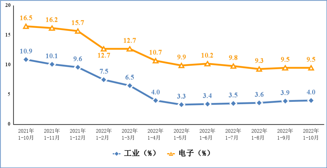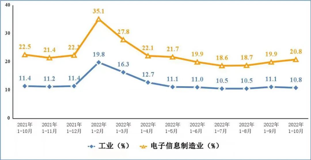 1—10 月份,我国电子信息制造业生产稳定增长,出口规模增速呈下降趋势,企业效益逐步恢复,投资增速保持高位。