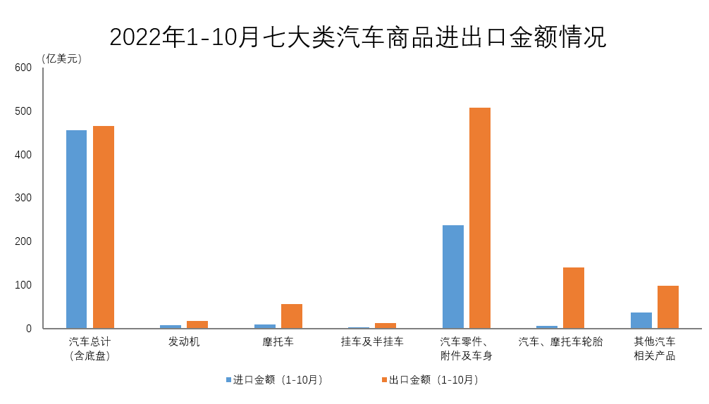 中国汽车工业协会:2022年10月海关进出口情况简析 据中国汽车工业协会整理的海关总署数据显示,2022年10月,与上月相比,汽车商品进口金额有所下降,出口金额呈小幅增长;与上年同期相比,汽车商品进、出口金额均呈较快增长。 2022年10月,汽车商品进出口总额为217.6亿美元,环比下降0.8%,同比增长26.5%。其中进口金额66.2亿美元,环比下降8.8%,同比增长17.2%;出口金额151.4亿美元,环比增长3.1%,同比增长31.1%。 2022年1-10月,全国汽车商品累计进出口总额为2050.6亿美元,同比增长12.3%,增速略高于1-9月。其中进口金额750.7亿美元,同比下降5.8%,降幅比1-9月有所收窄;出口金额1299.9亿美元,同比增长26.2%,增速比1-9月略有提升。 更多阅读:中国汽车工业协会:2024年5月海关进出口情况简析中国汽车工业协会:2022年12月海关进出口情况简析中国汽车工业协会:2022年11月海关进出口情况简析中国汽车工业协会:2022年3月全国海关汽车商品进出口数据中国汽车工业协会:2023年1-2月我国汽车商品出口金额前十国情况简析中国汽车工业协会:2022年3月前十位轿车品牌销量排名中国汽车工业协会:2021年5月汽车工业运行情况简述中国汽车工业协会:2024年6月海关进出口情况简析中国汽车工业协会:2025年4月汽车商品进出口总额为230.9亿美元中国汽车工业协会:2023年1-8月前十位轿车生产企业销售情况简析中国汽车工业协会:2023年1-8月汽车制造业工业增加值保持较快增长中国汽车工业协会:2023年1-7月七大类汽车商品进出口金额情况中国汽车工业协会:2023年1-8月前十位SUV生产企业销售情况简析中国汽车工业协会:2023年6月中国汽车整车出口情况简析中国汽车工业协会:2023年上半年汽车制造业工业增加值继续保持两位数增长