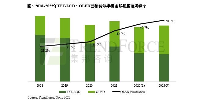 近日消息,据TrendForce集邦咨询最新报告,随着OLED面板在手机应用上逐渐增加,预估2022年采用OLED面板的手机渗透率约47.7%,至2023年将达50.8%,2026年则预计超越六成。