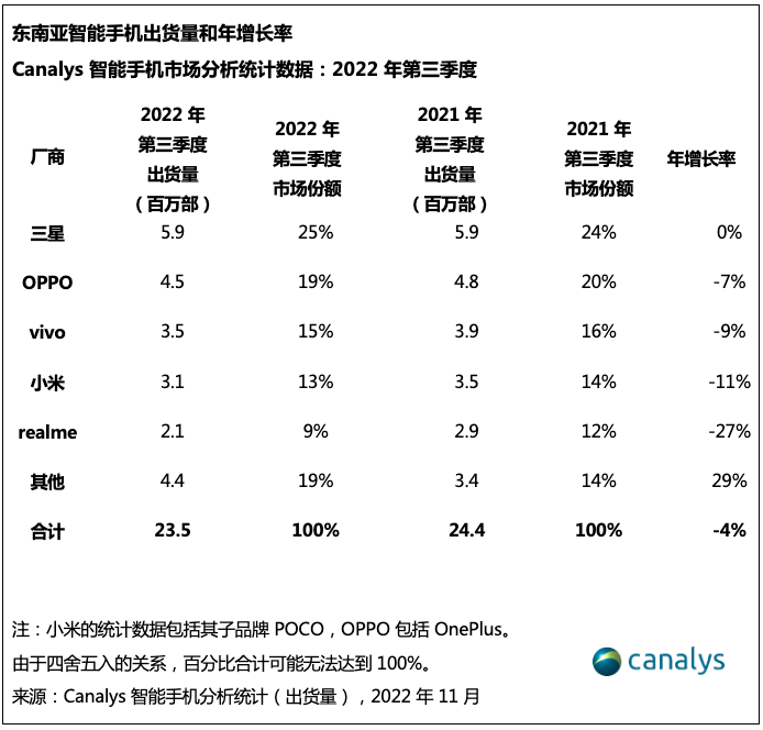 Canalys 近日发布报告称,消费者需求的持续低迷导致东南亚智能手机出货量在 2022 年第三季度同比下降 4%,跌至 2350 万部,这是该地区自 2020 年以来的最低水平。