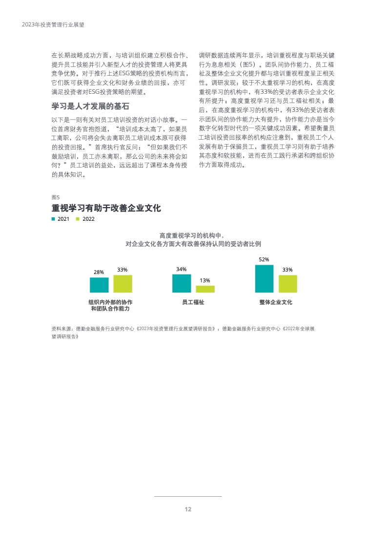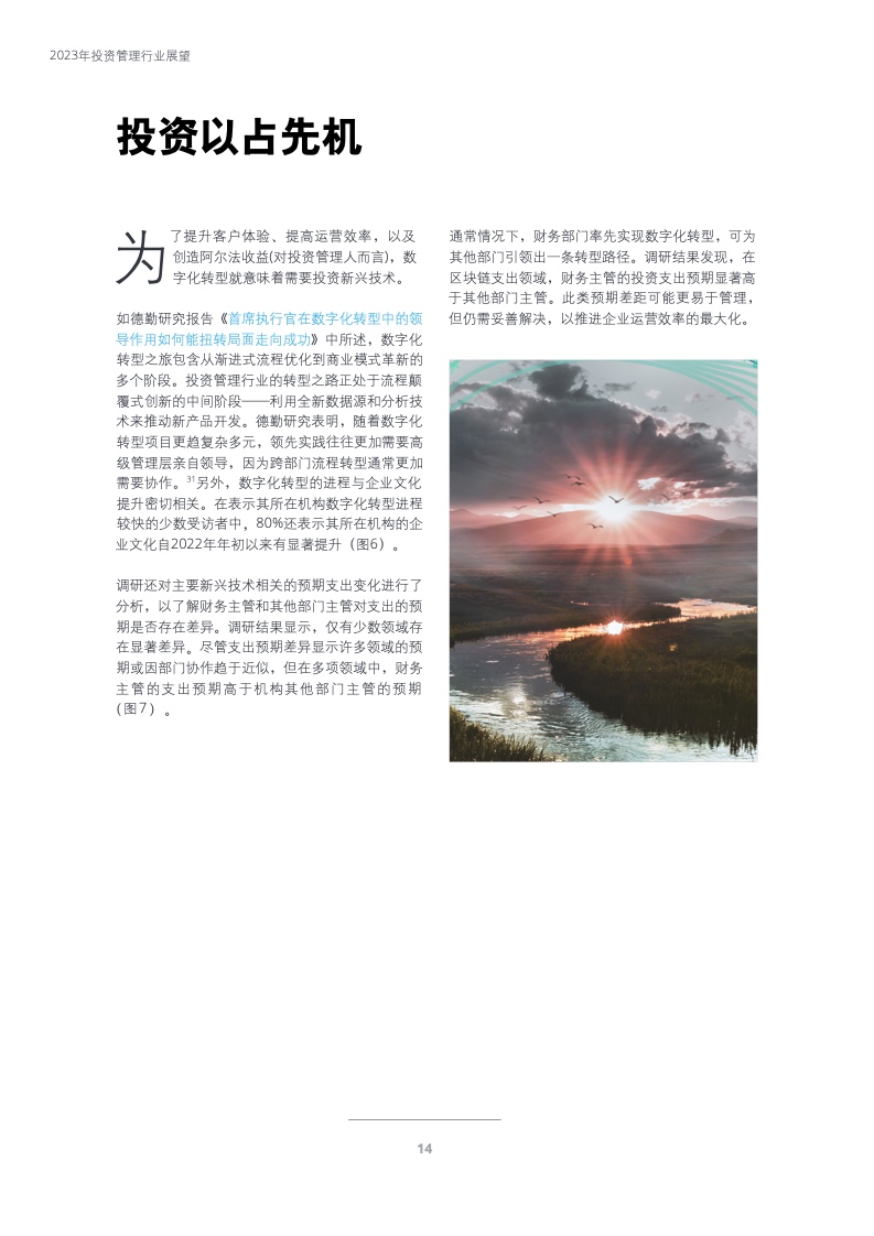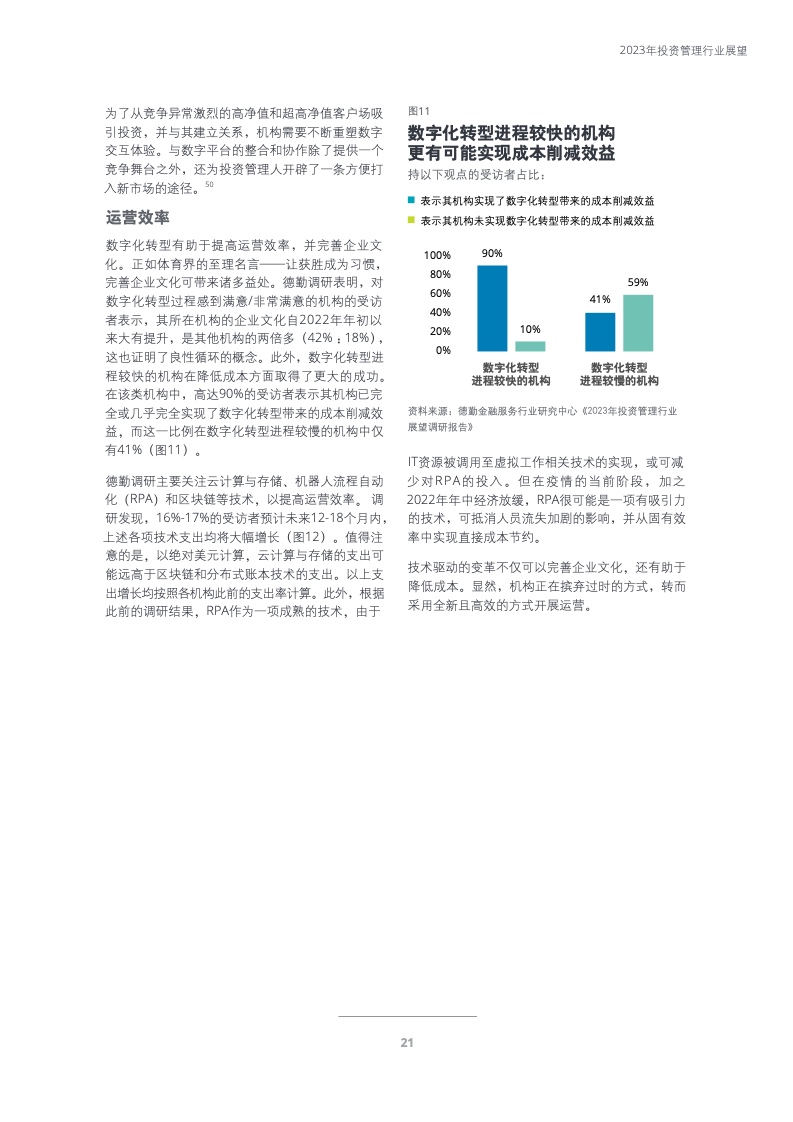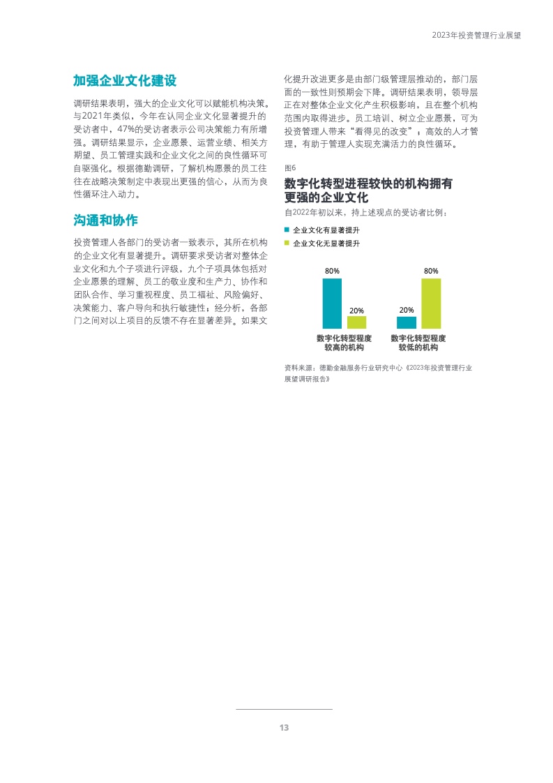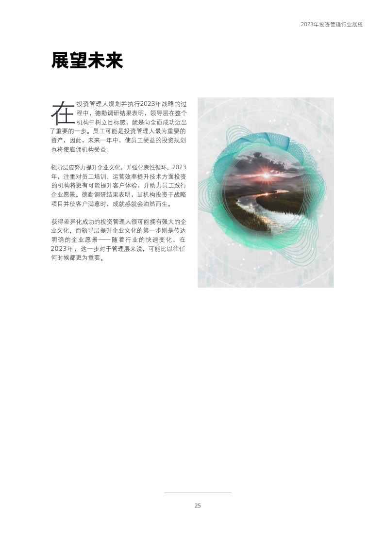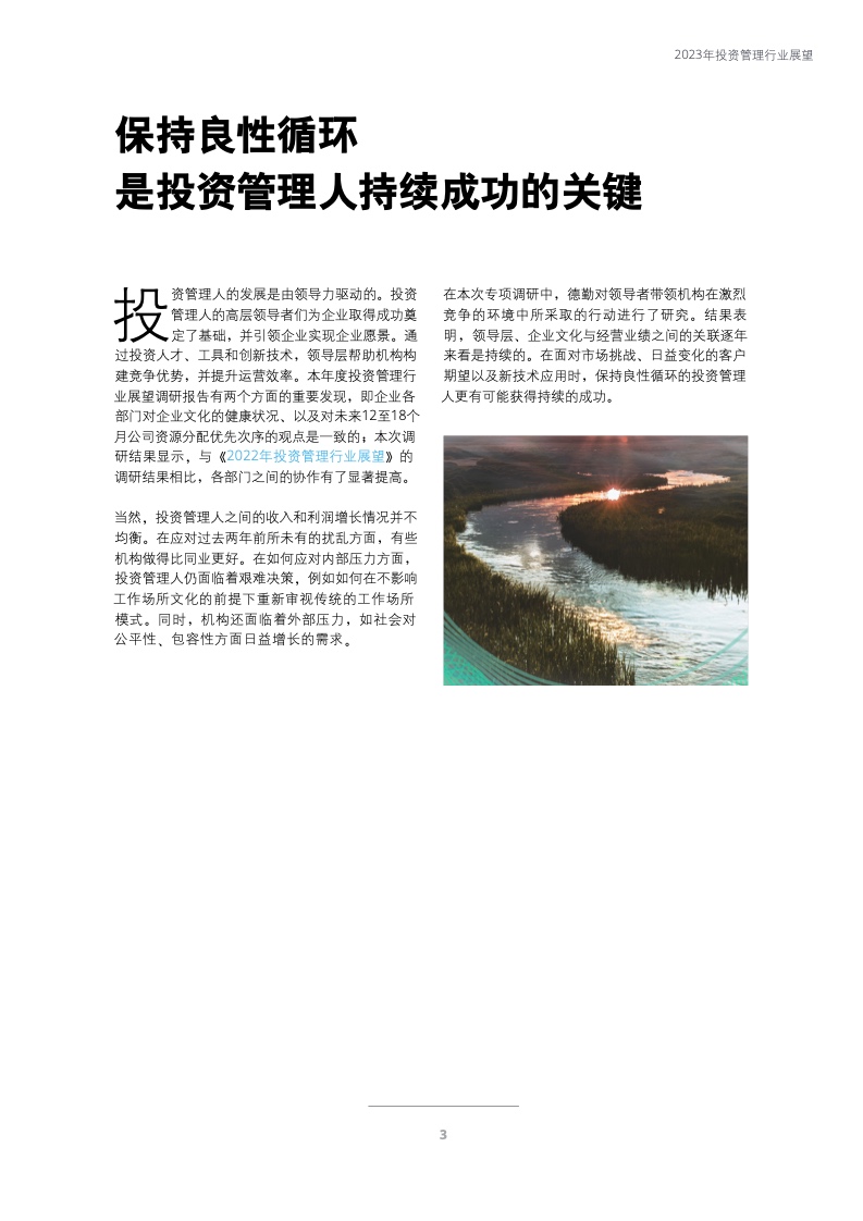在投资管理人规划并执行2023年战略的过程中,德勤调研结果表明,领导层在整个机构中树立目标感,就是向全面成功迈出了重要的一步。未来一年中,使员工受益的投资规划也将使雇佣机构受益。领导层应努力提升企业文化,并强化良性循环。2023年,注重对员工培训、运营效率提升技术方面投资的机构将更有可能提升客户体验,并助力员工践行企业愿景。