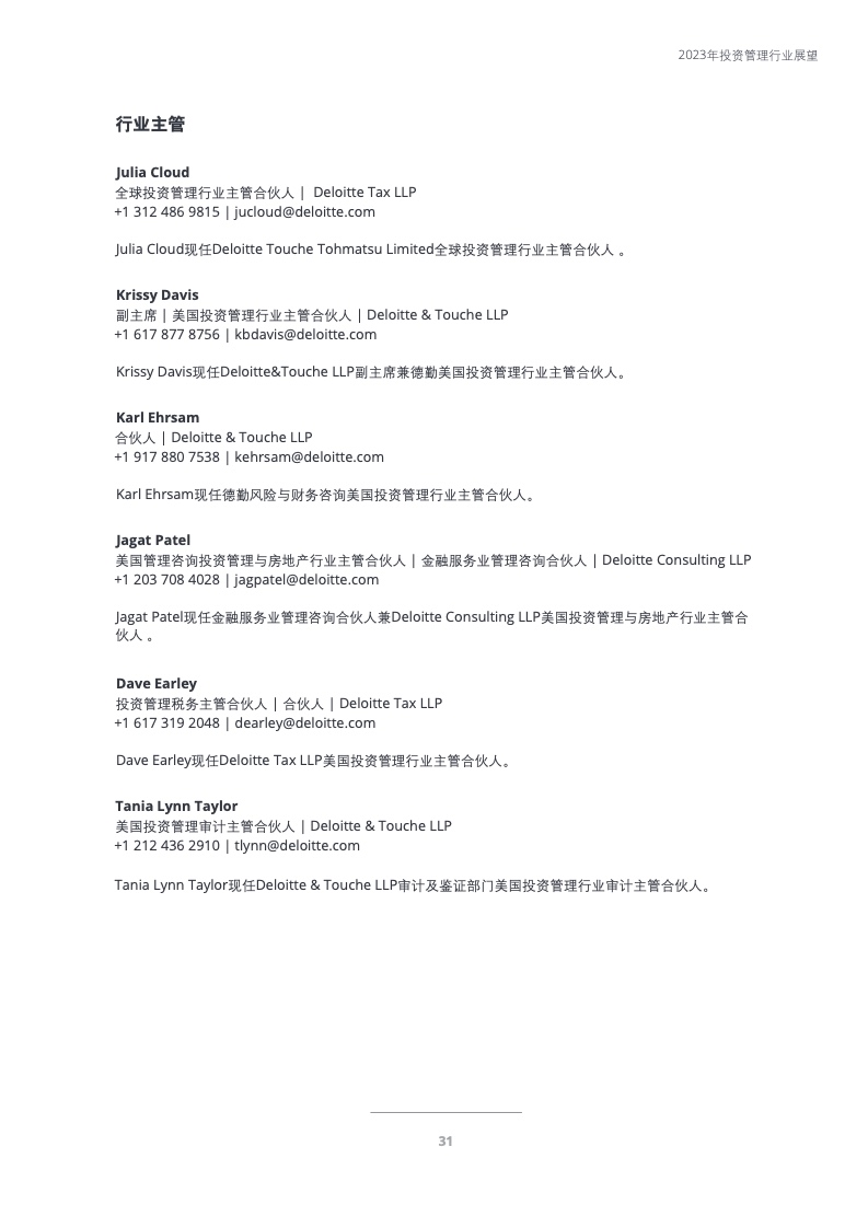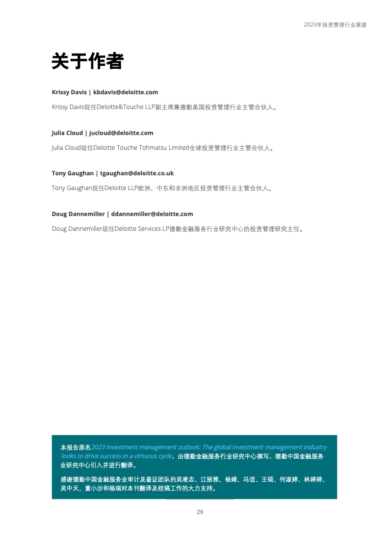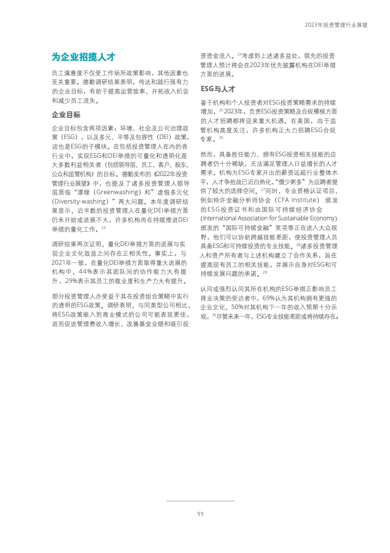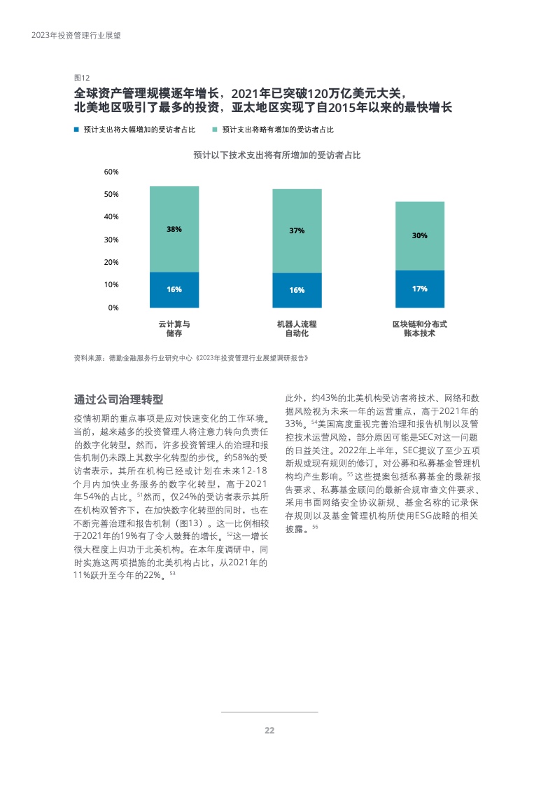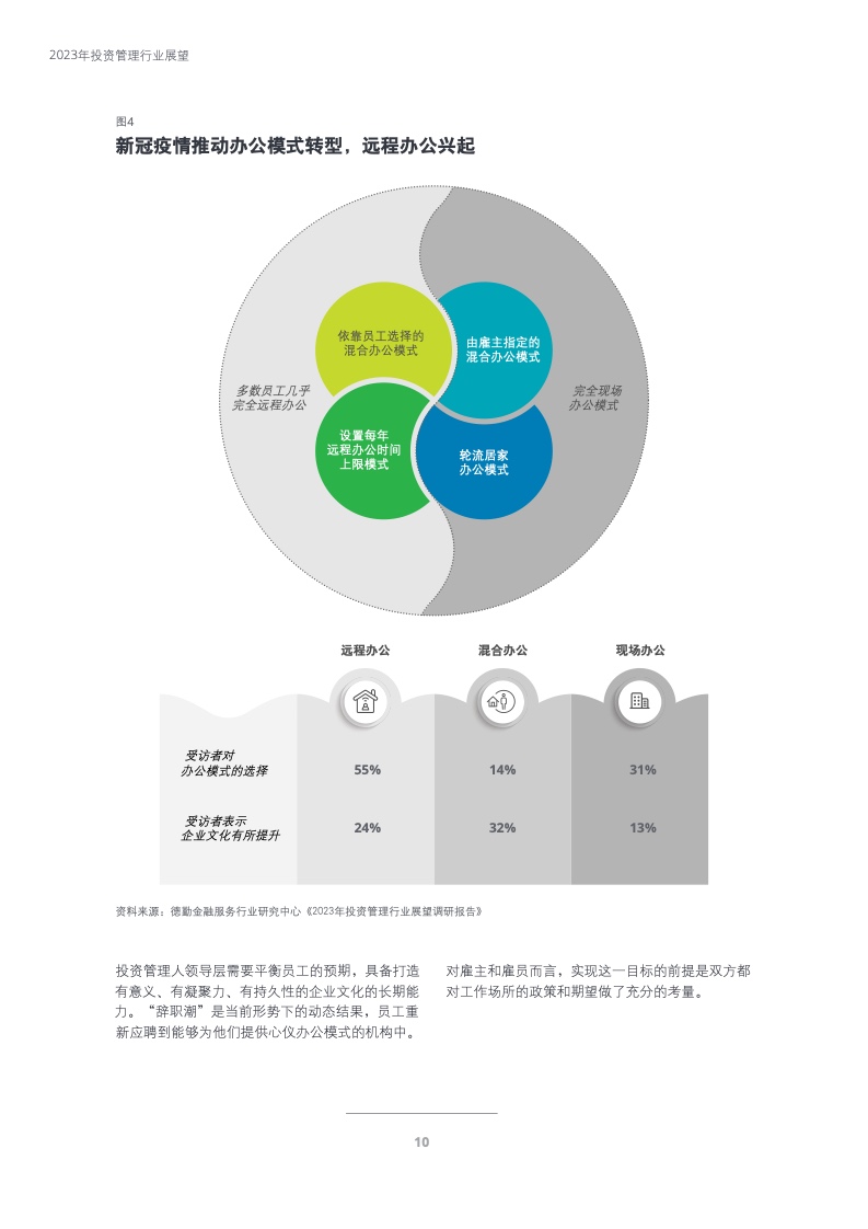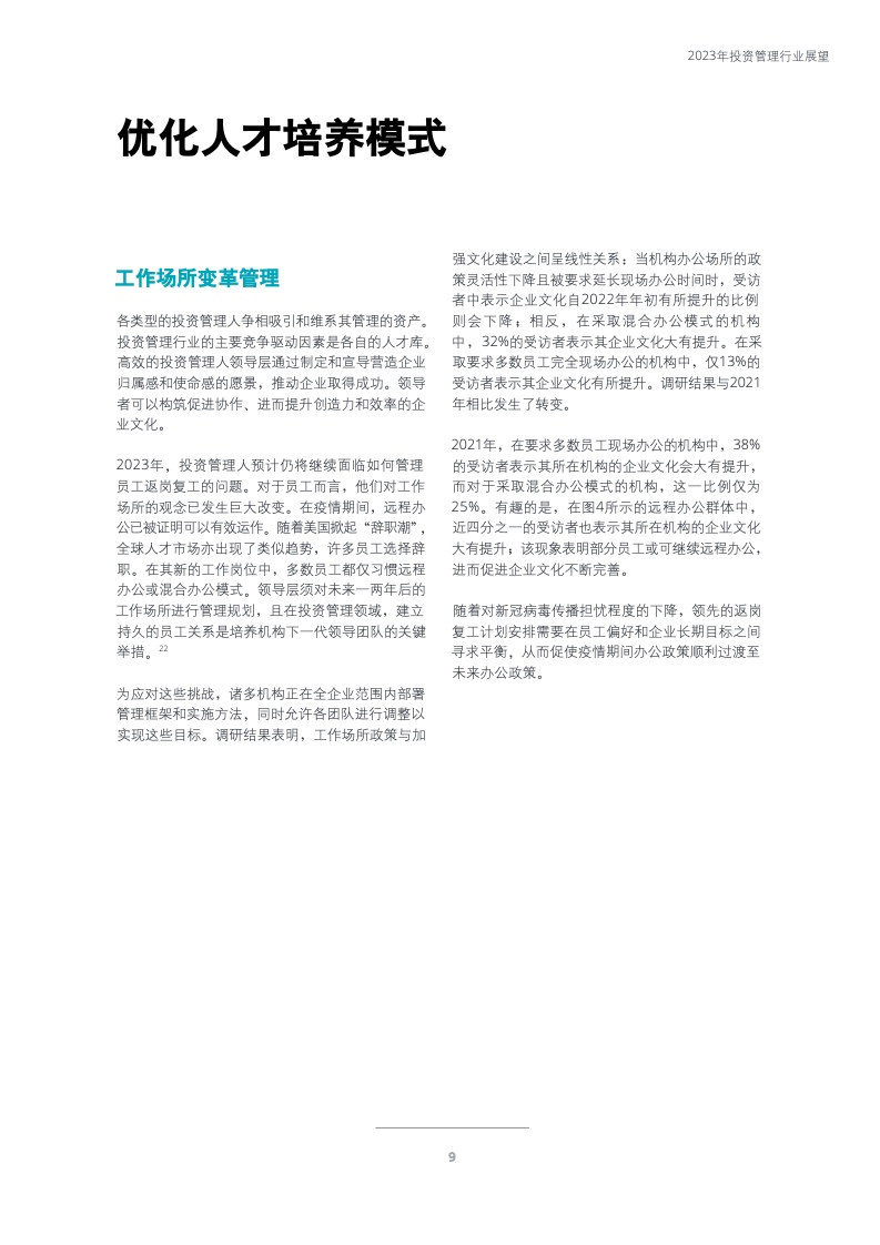 在投资管理人规划并执行2023年战略的过程中,德勤调研结果表明,领导层在整个机构中树立目标感,就是向全面成功迈出了重要的一步。未来一年中,使员工受益的投资规划也将使雇佣机构受益。领导层应努力提升企业文化,并强化良性循环。2023年,注重对员工培训、运营效率提升技术方面投资的机构将更有可能提升客户体验,并助力员工践行企业愿景。