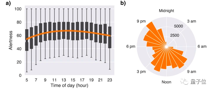 下方ab图表为不同呈现方式,但都能看出,人体从早上开始大脑清醒程度开始提升,到中午达到峰值,再到晚上持续下降: