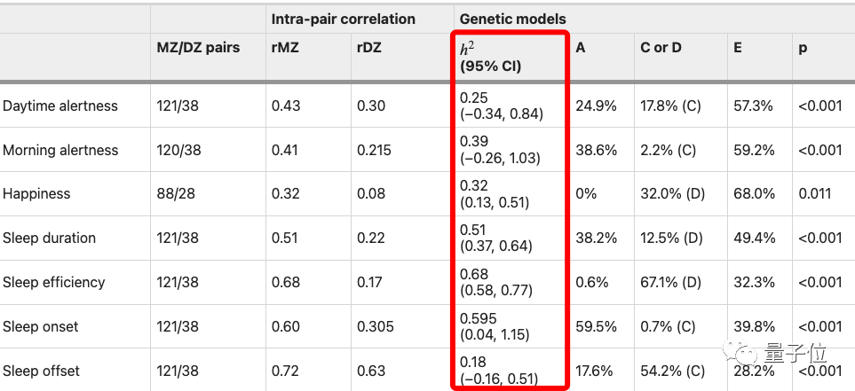 他们发现,基因确实会影响一个人的睡眠时长及质量,从下表能看出,关联值(h平方)集中在一个区间内,数值也较高。
