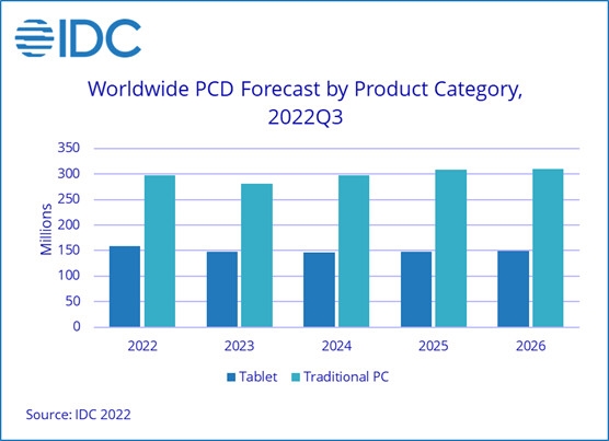 时间拉长到2022到2026年的跨度,IDC预计消费级PC/平板出货量的年化降幅为0.5个百分点,2026年的总出货将跌至2.6亿部。