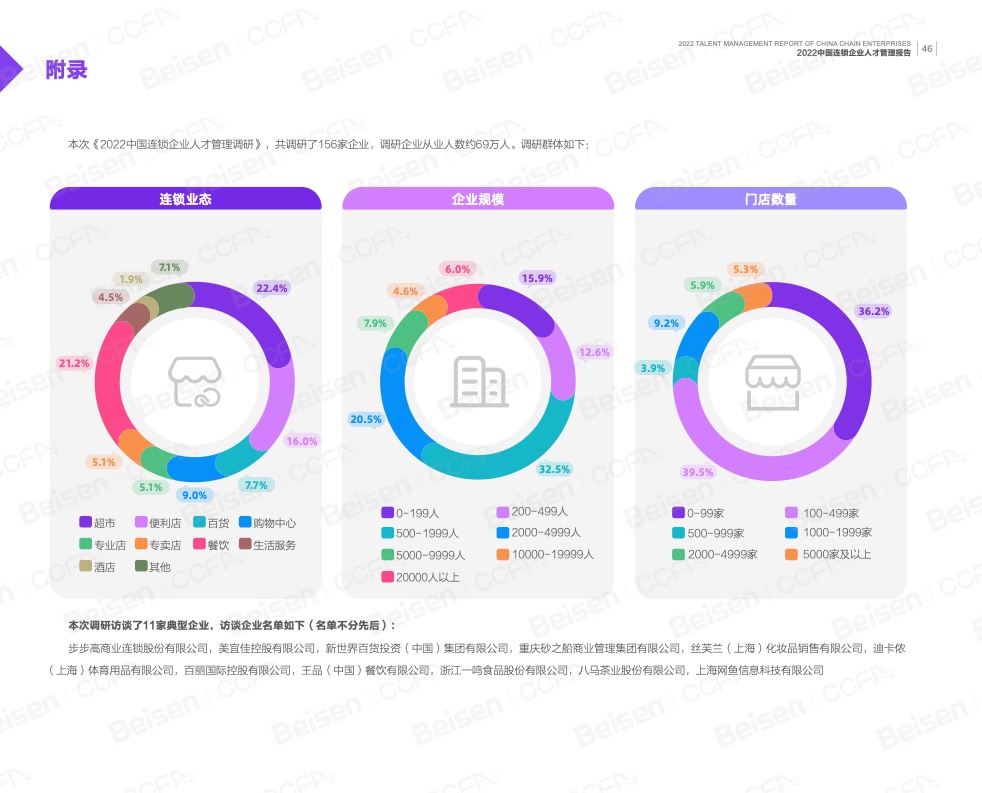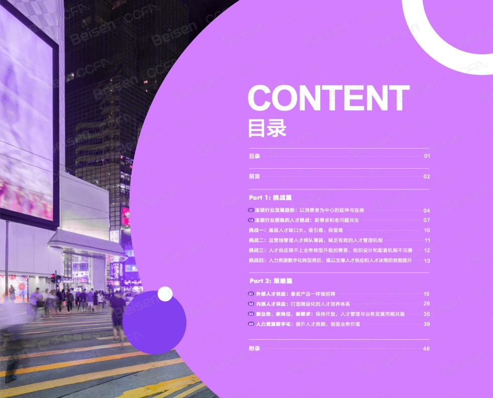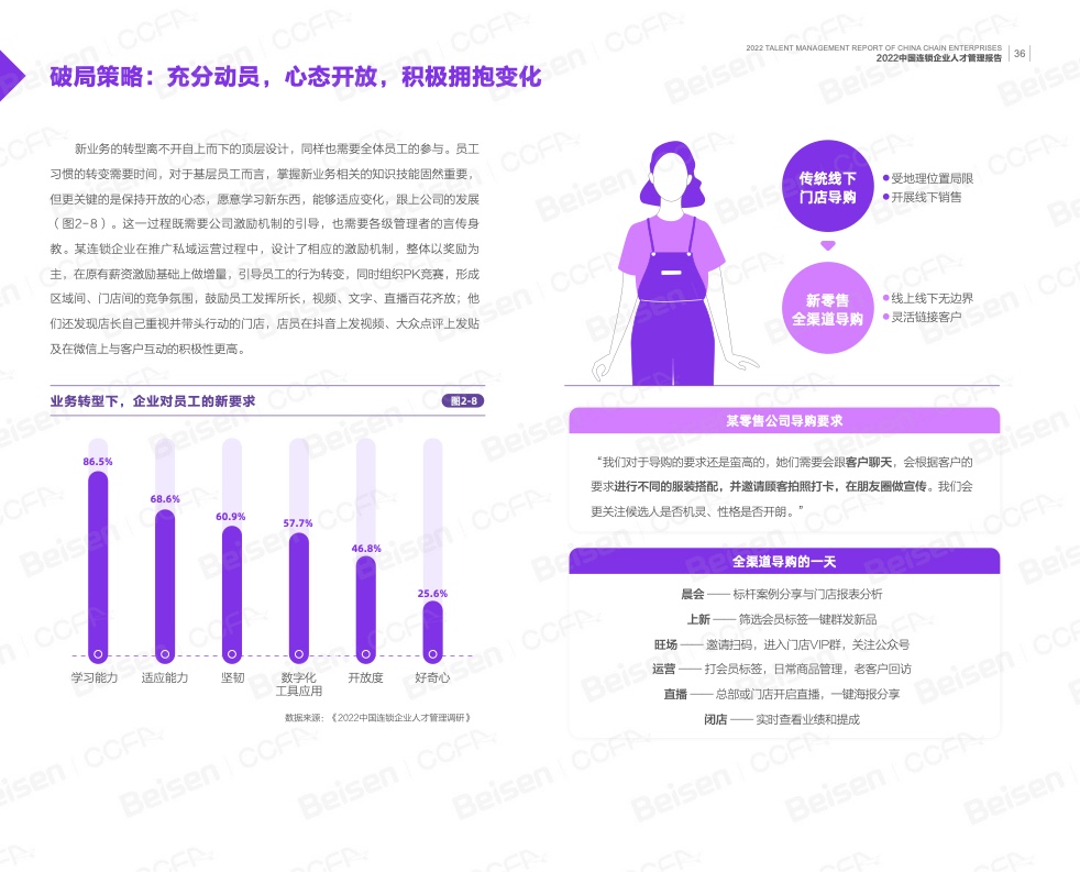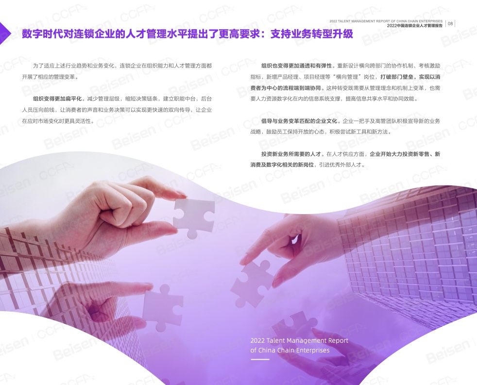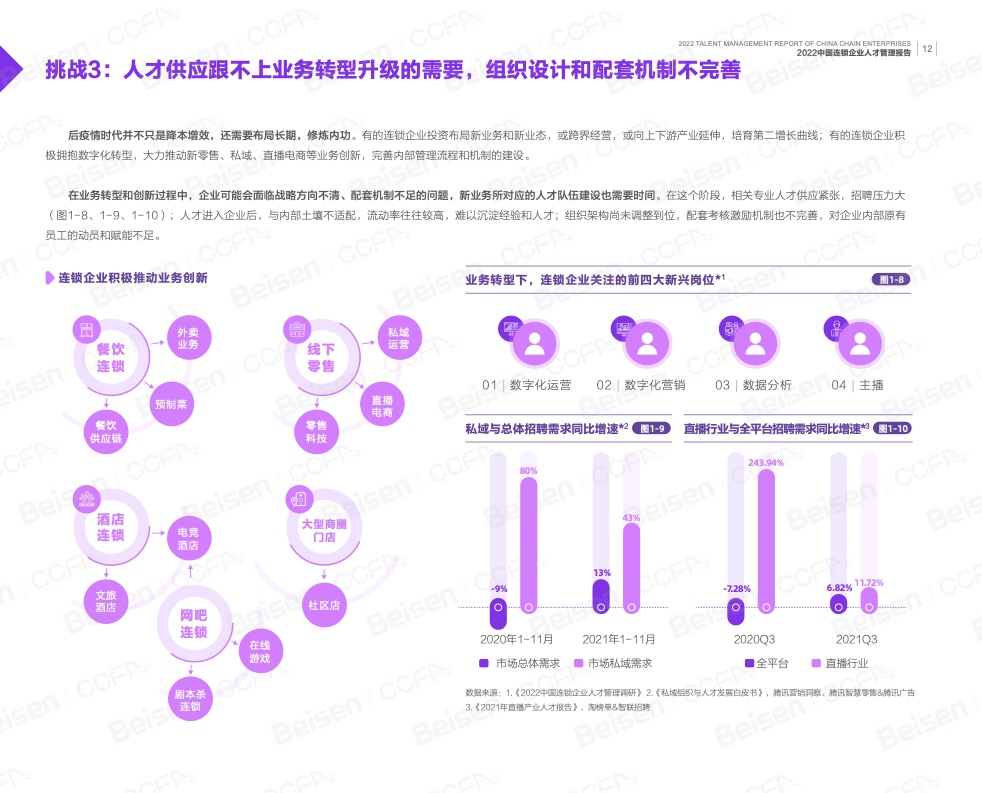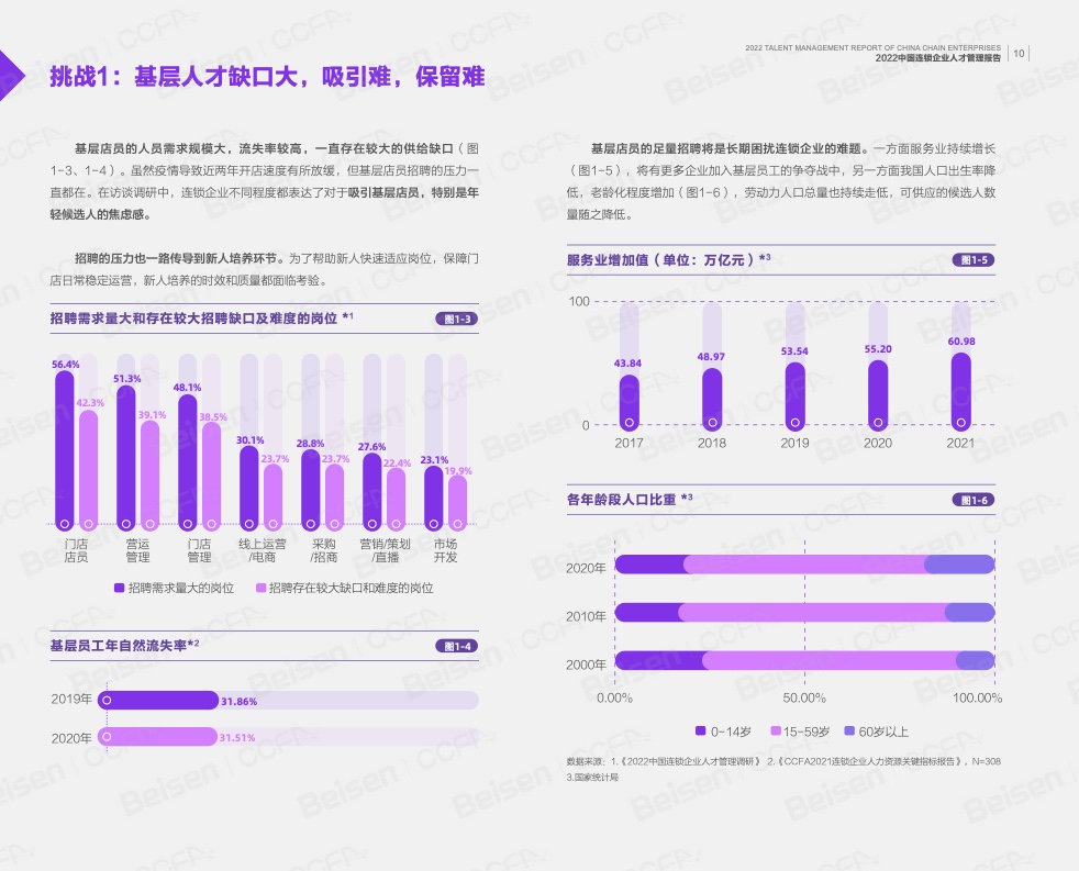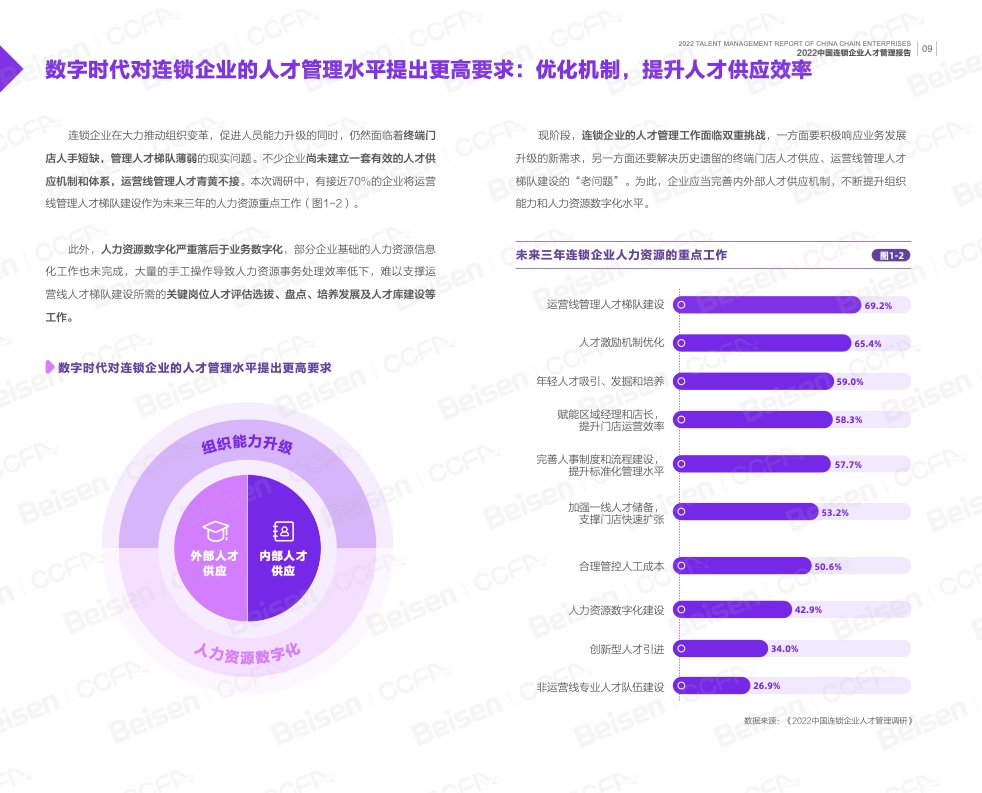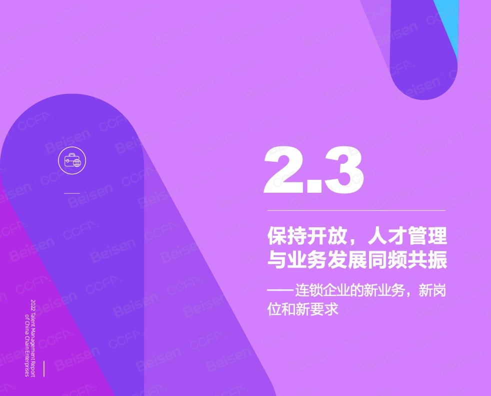 针对以上问题,本报告对连锁企业运营线的内外部人才供应,新业务、新岗位的人才管理工作,以及人力资源的数字化建 设进行了探讨,提出了人才管理工作的策略和行动建议,希望对企业有所启发和借鉴。
