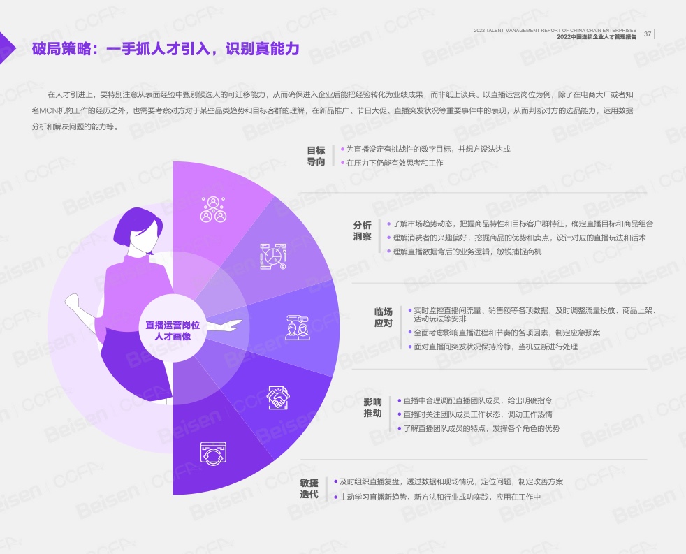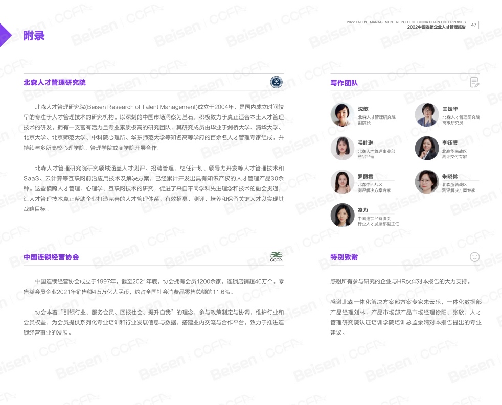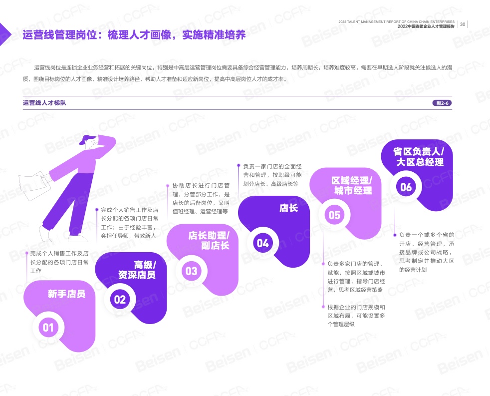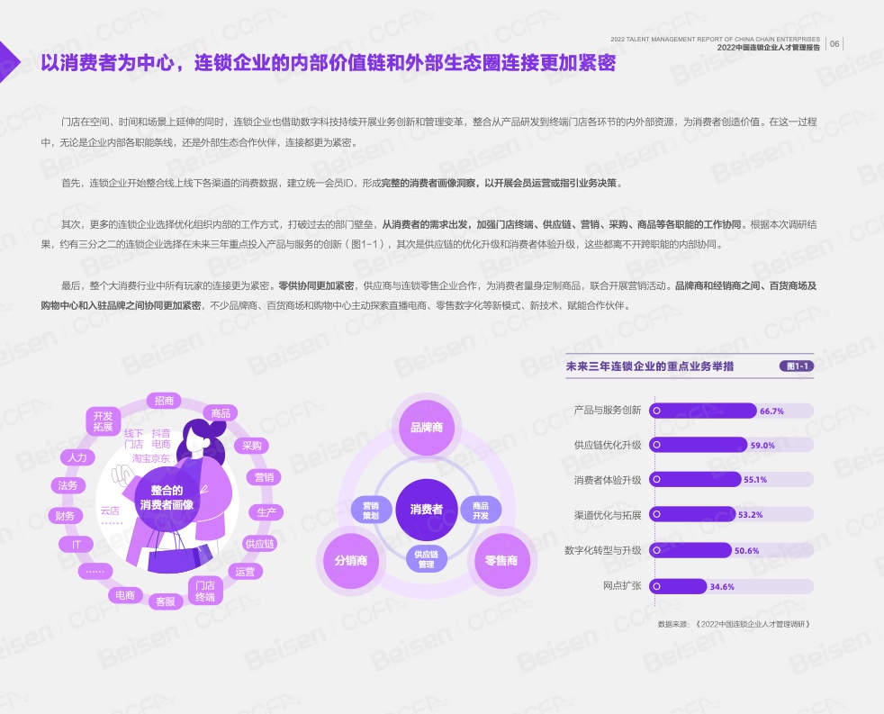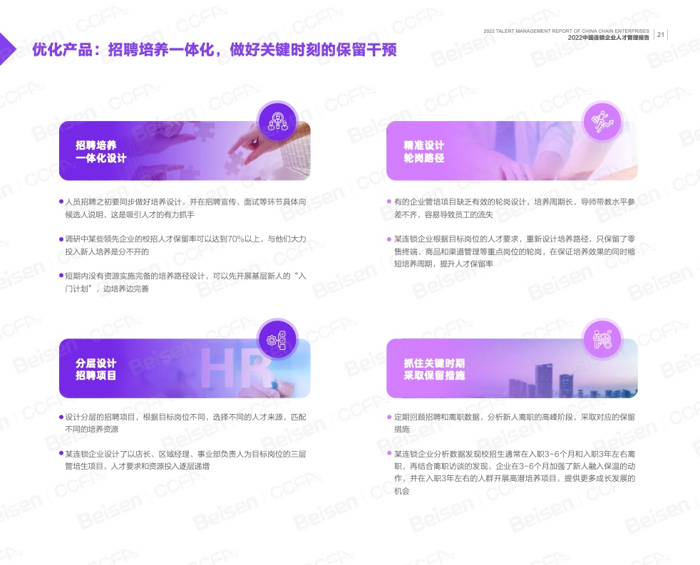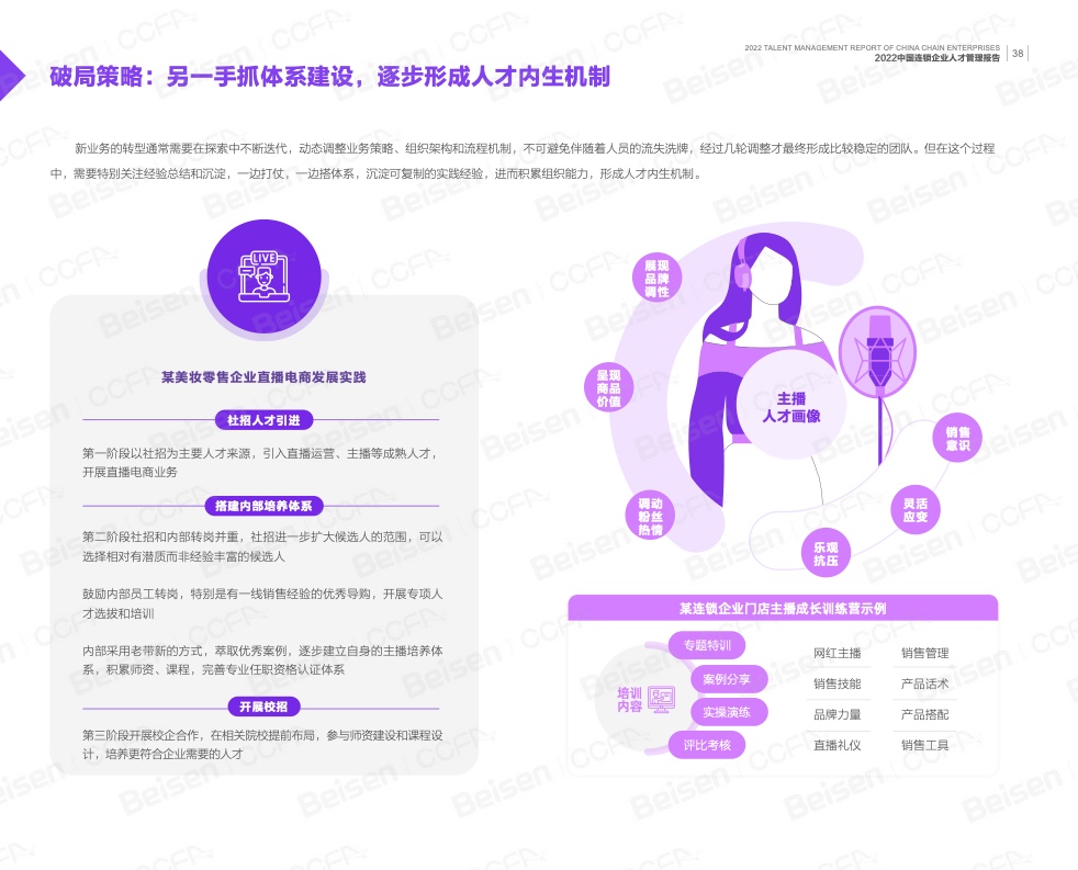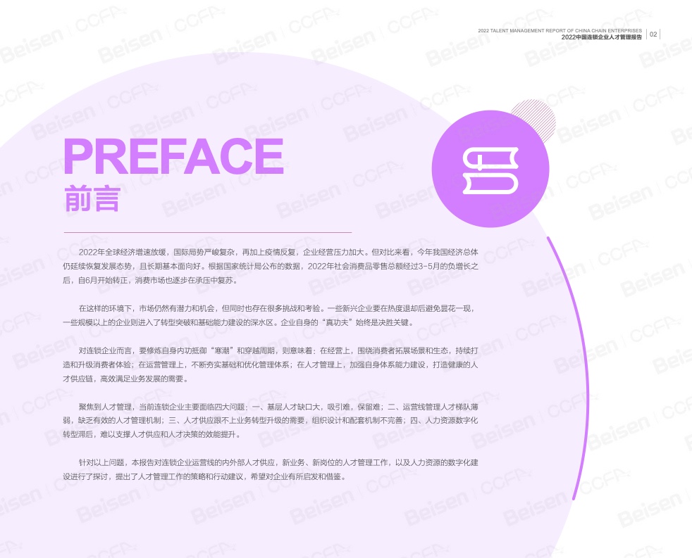 针对以上问题,本报告对连锁企业运营线的内外部人才供应,新业务、新岗位的人才管理工作,以及人力资源的数字化建 设进行了探讨,提出了人才管理工作的策略和行动建议,希望对企业有所启发和借鉴。