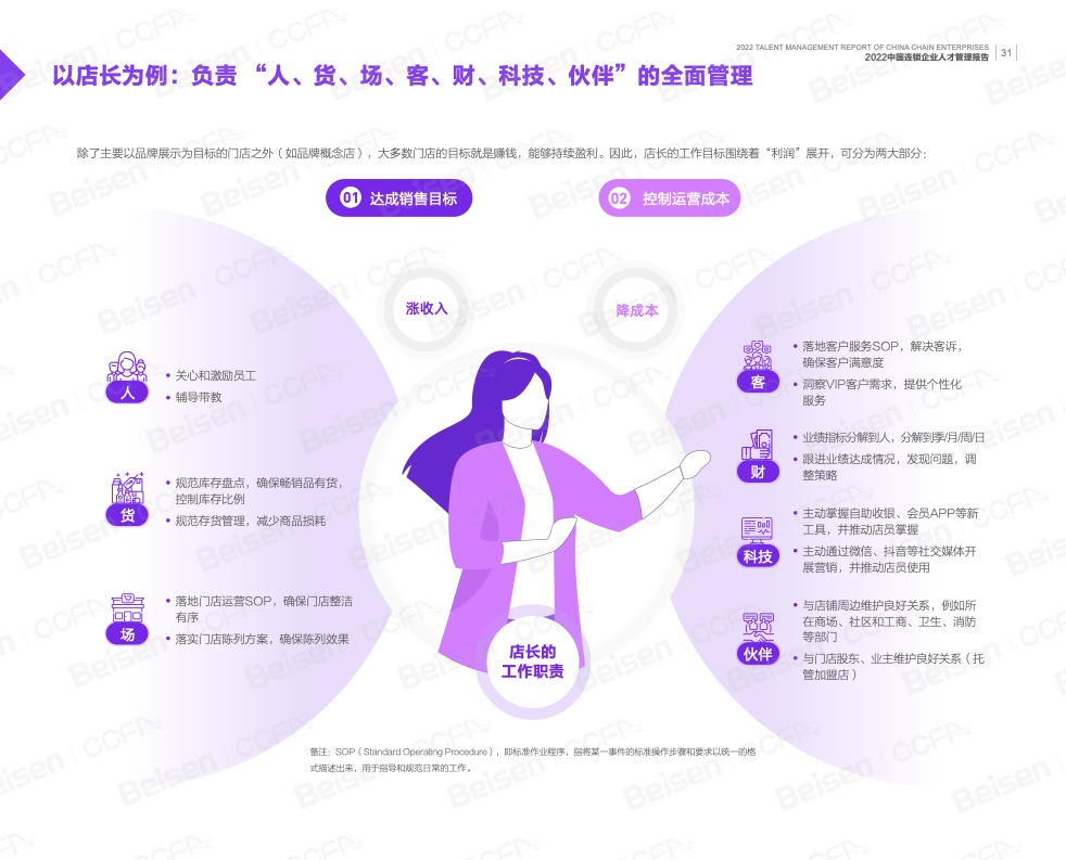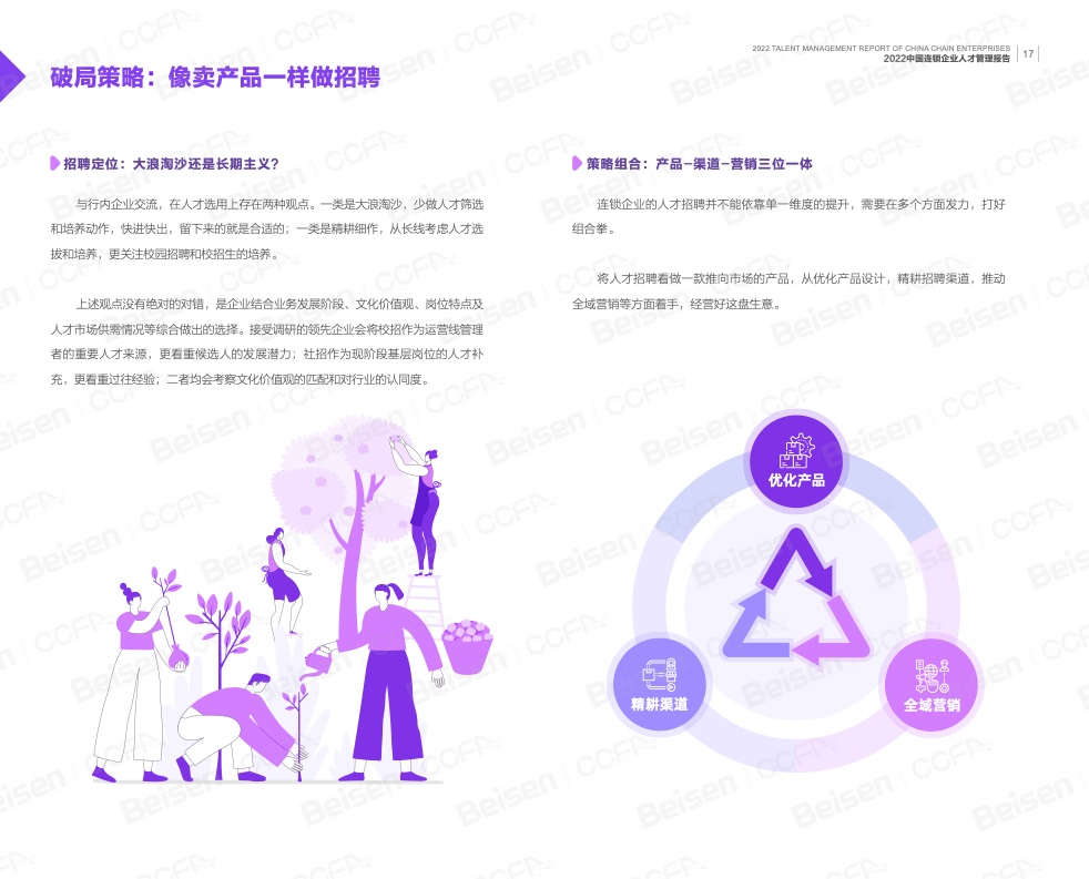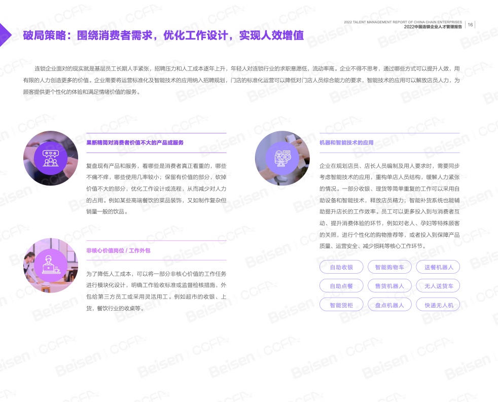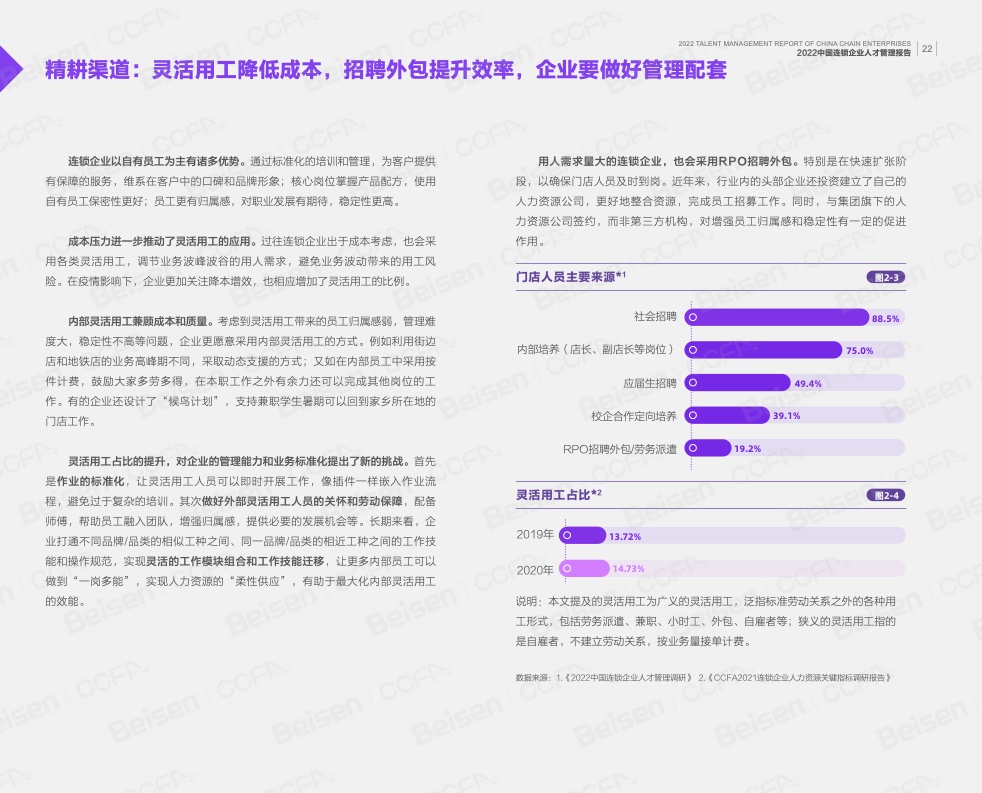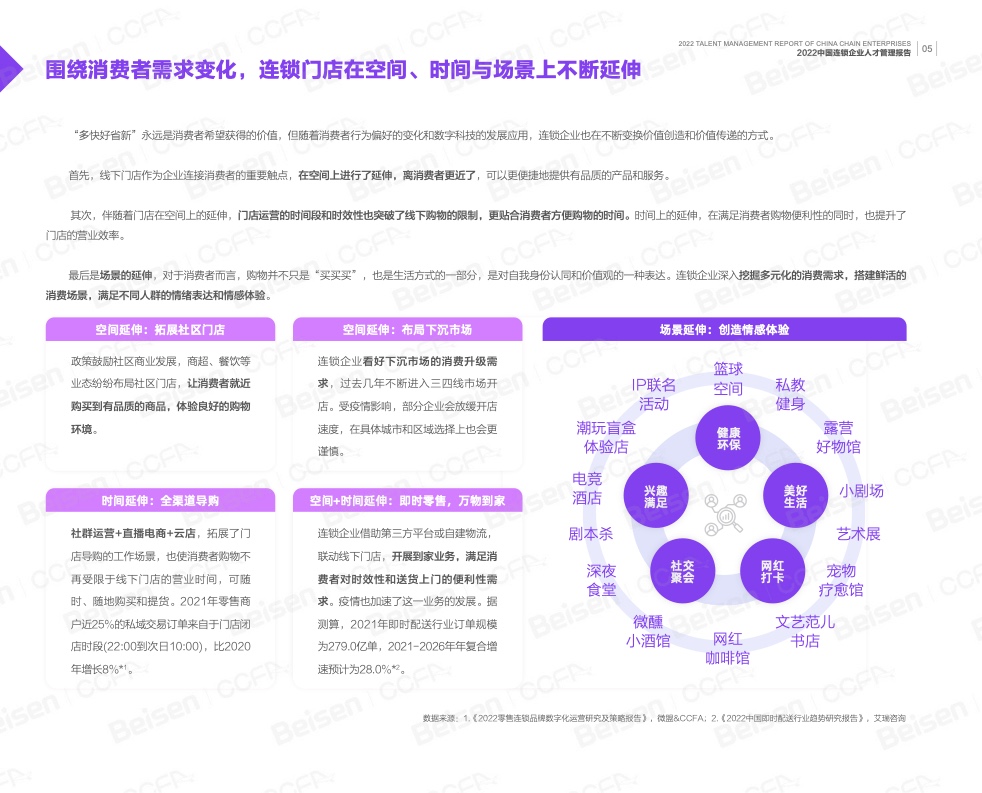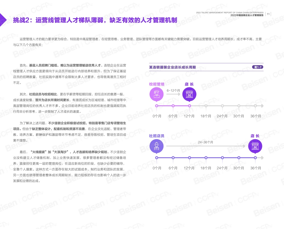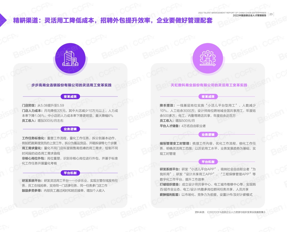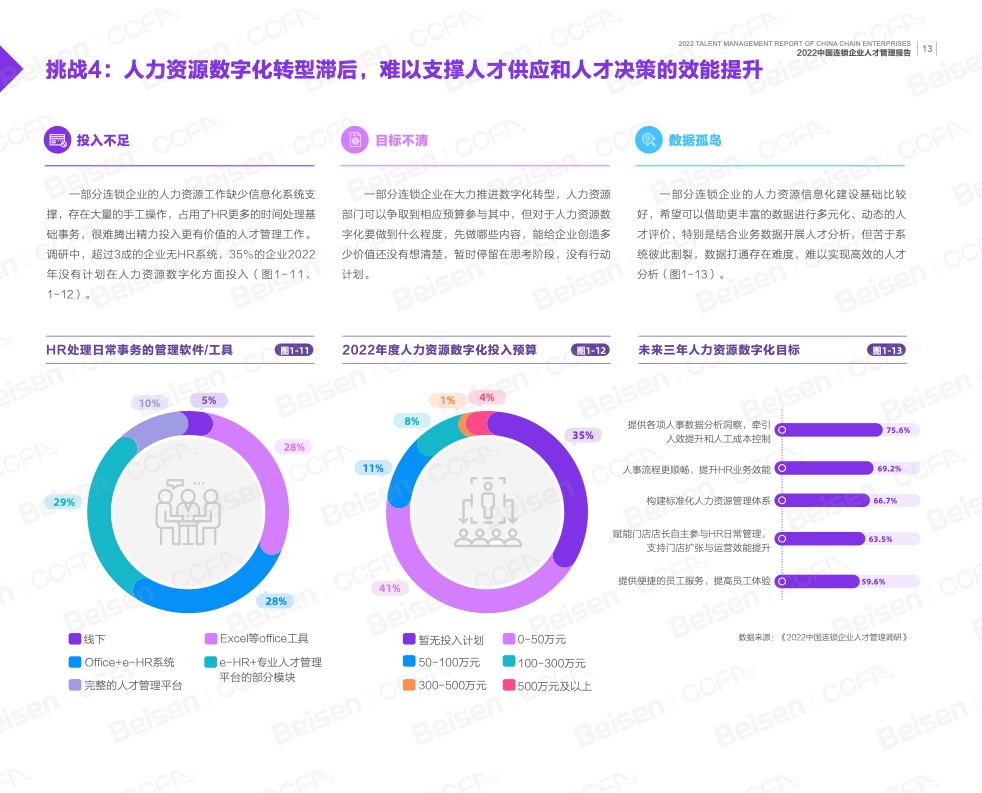 针对以上问题,本报告对连锁企业运营线的内外部人才供应,新业务、新岗位的人才管理工作,以及人力资源的数字化建 设进行了探讨,提出了人才管理工作的策略和行动建议,希望对企业有所启发和借鉴。