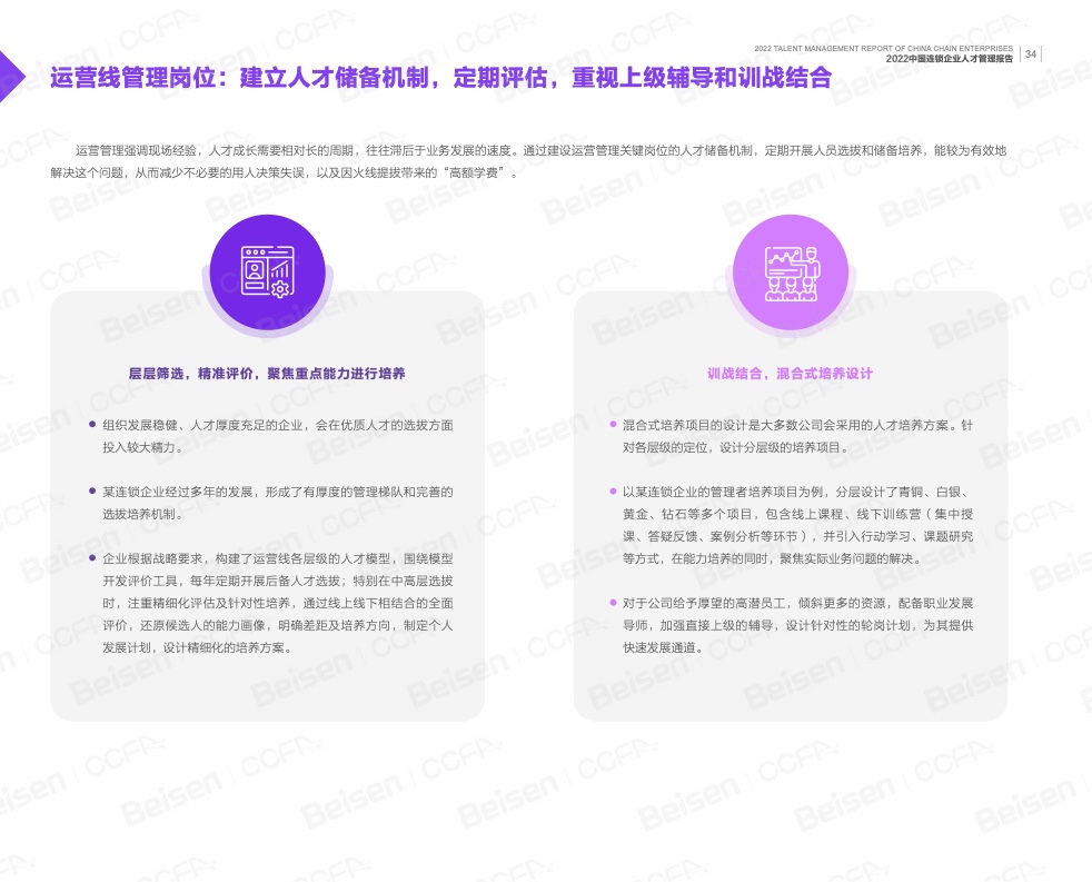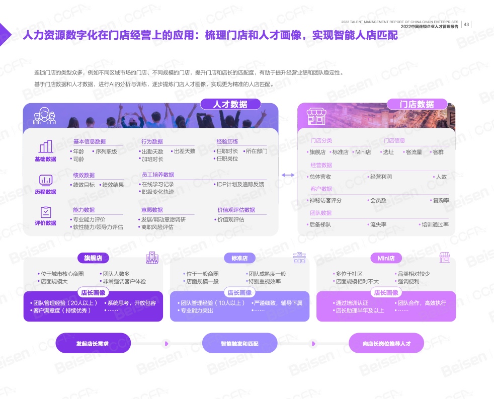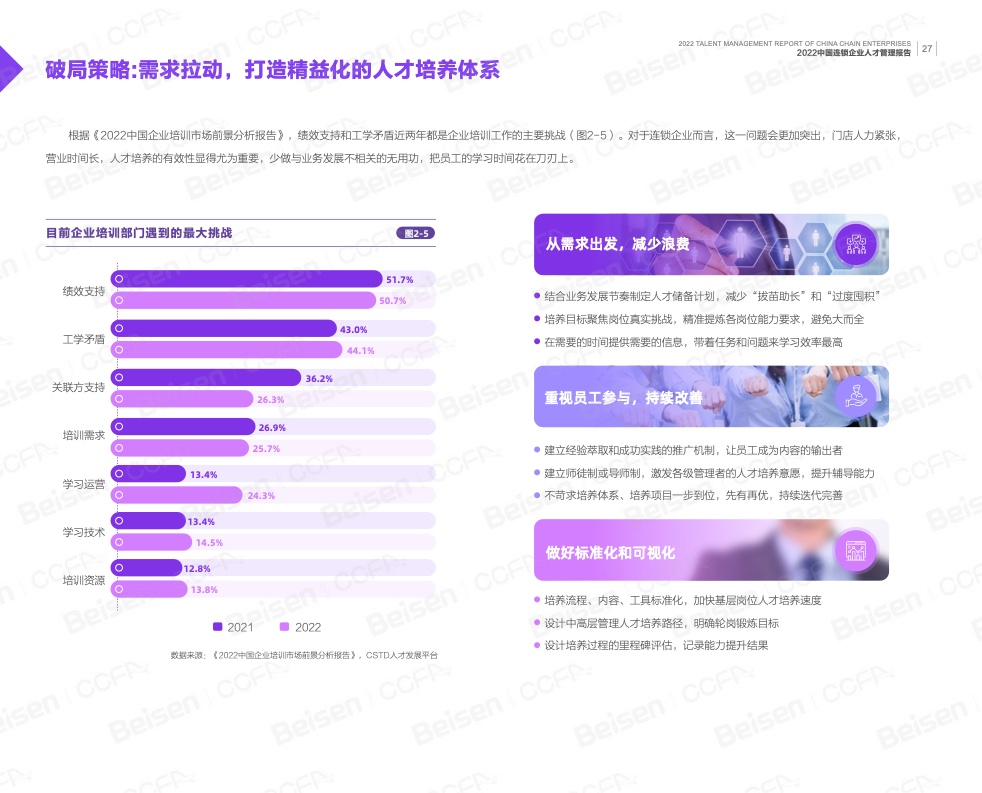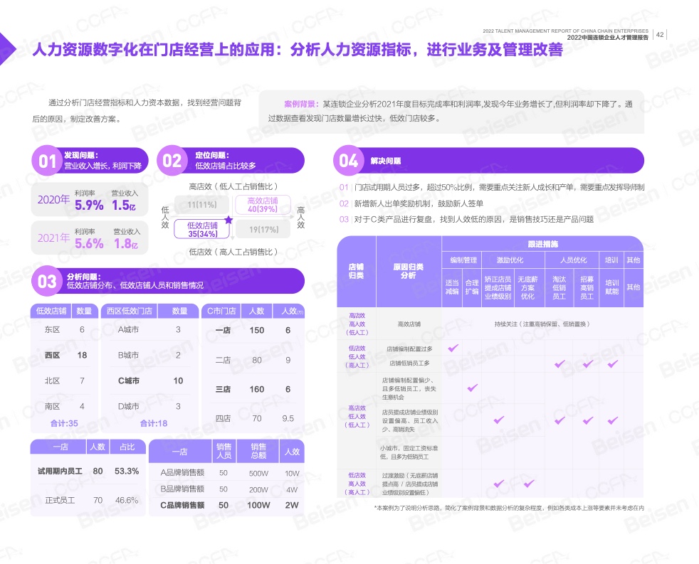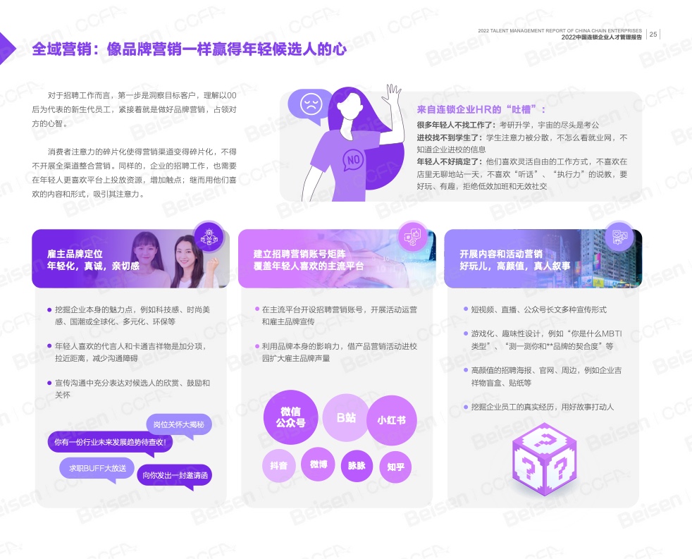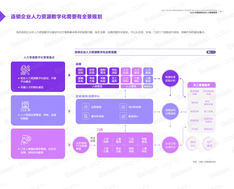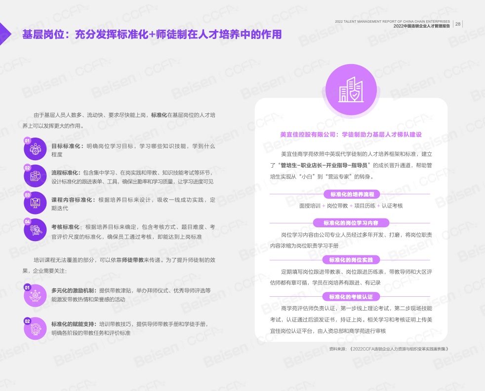 针对以上问题,本报告对连锁企业运营线的内外部人才供应,新业务、新岗位的人才管理工作,以及人力资源的数字化建 设进行了探讨,提出了人才管理工作的策略和行动建议,希望对企业有所启发和借鉴。